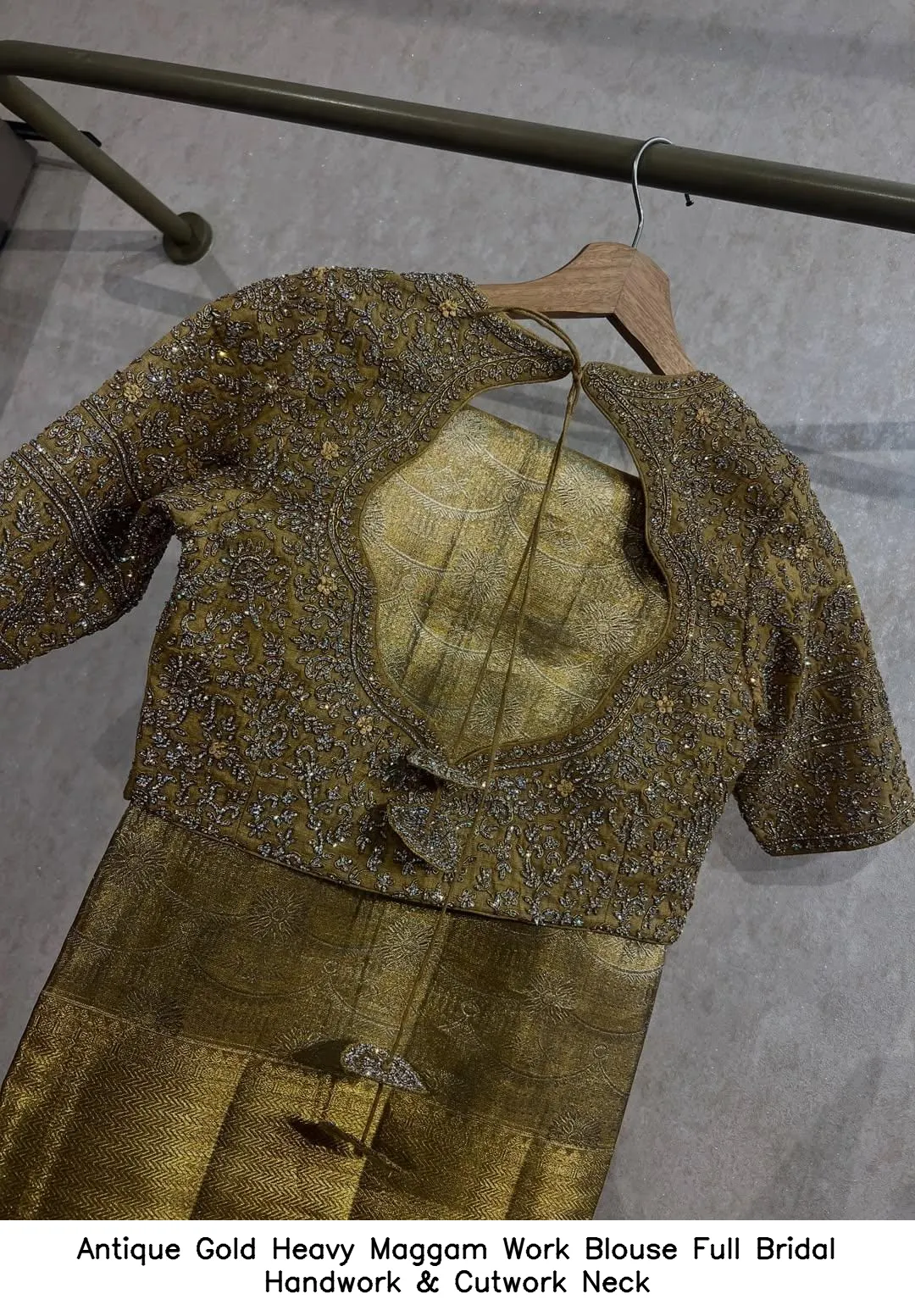Antique Gold Heavy Maggam Work Blouse – Full Bridal Handwork & Cutwork Neck