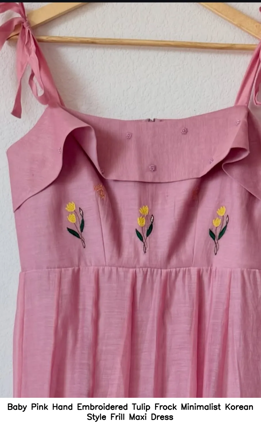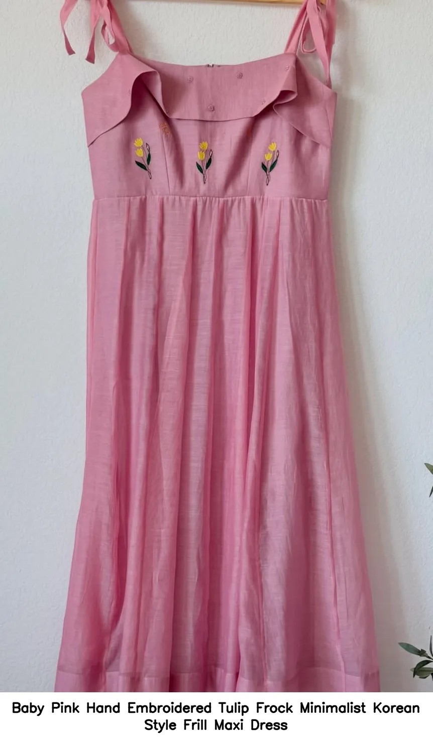 Baby Pink Hand Embroidered Tulip Frock Minimalist Korean Style Frill Maxi Dress