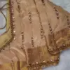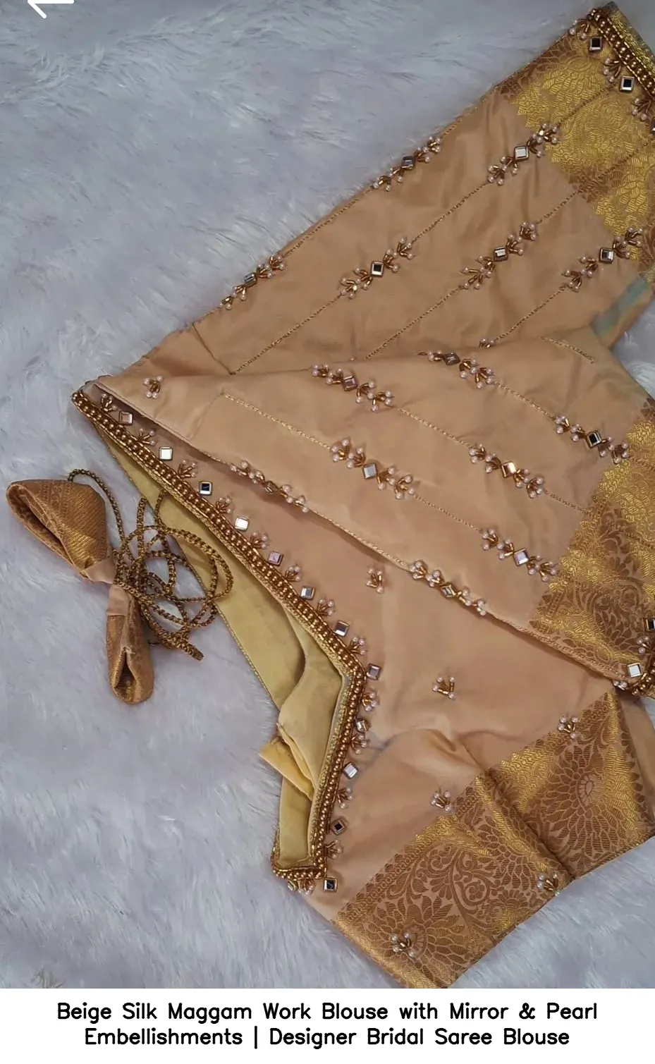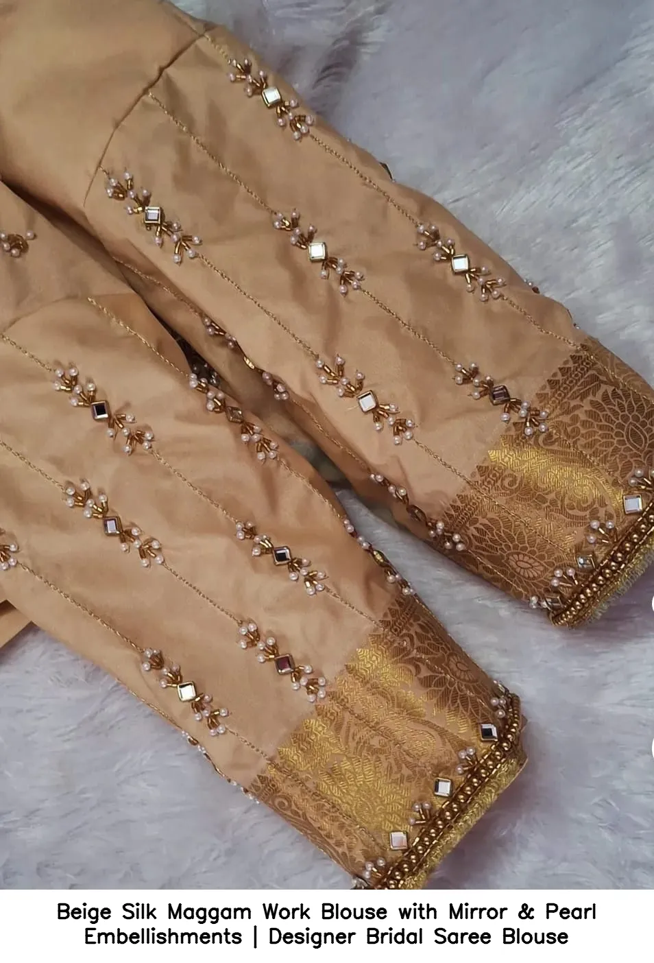 Product Name: Beige Silk Maggam Work Blouse with Mirror & Pearl Embellishments | Designer Bridal Saree Blouse