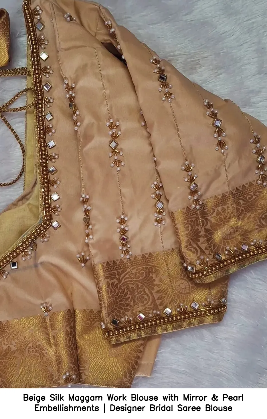 Beige Silk Maggam Work Blouse with Mirror & Pearl Embellishments | Designer Bridal Saree Blouse
