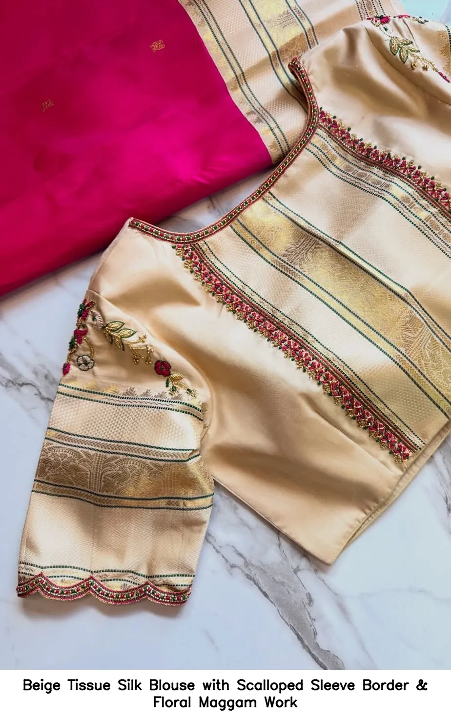 Beige Tissue Silk Blouse with Scalloped Sleeve Border & Floral Maggam Work