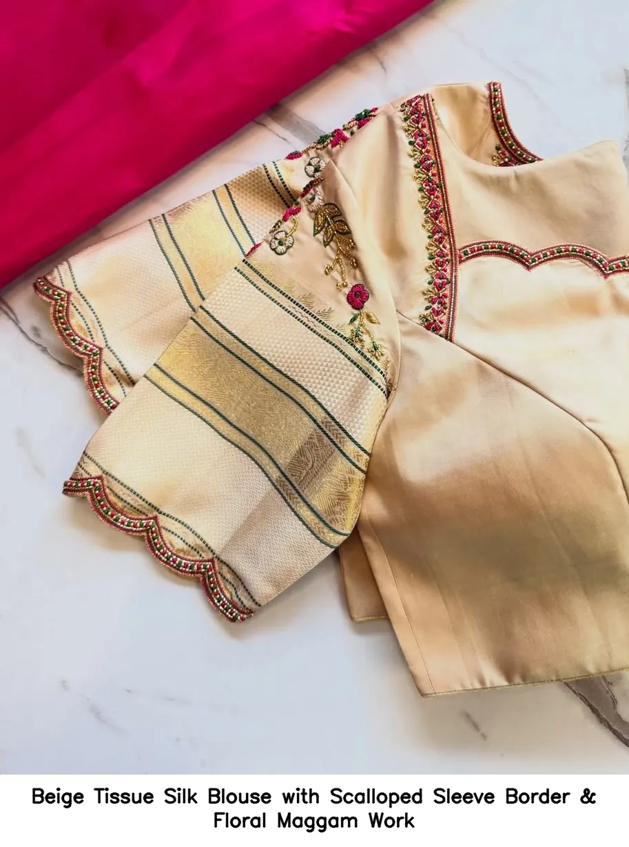 Product Name: โ€‹Beige Tissue Silk Blouse with Scalloped Sleeve Border & Floral Maggam Work