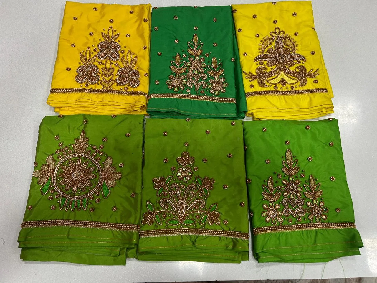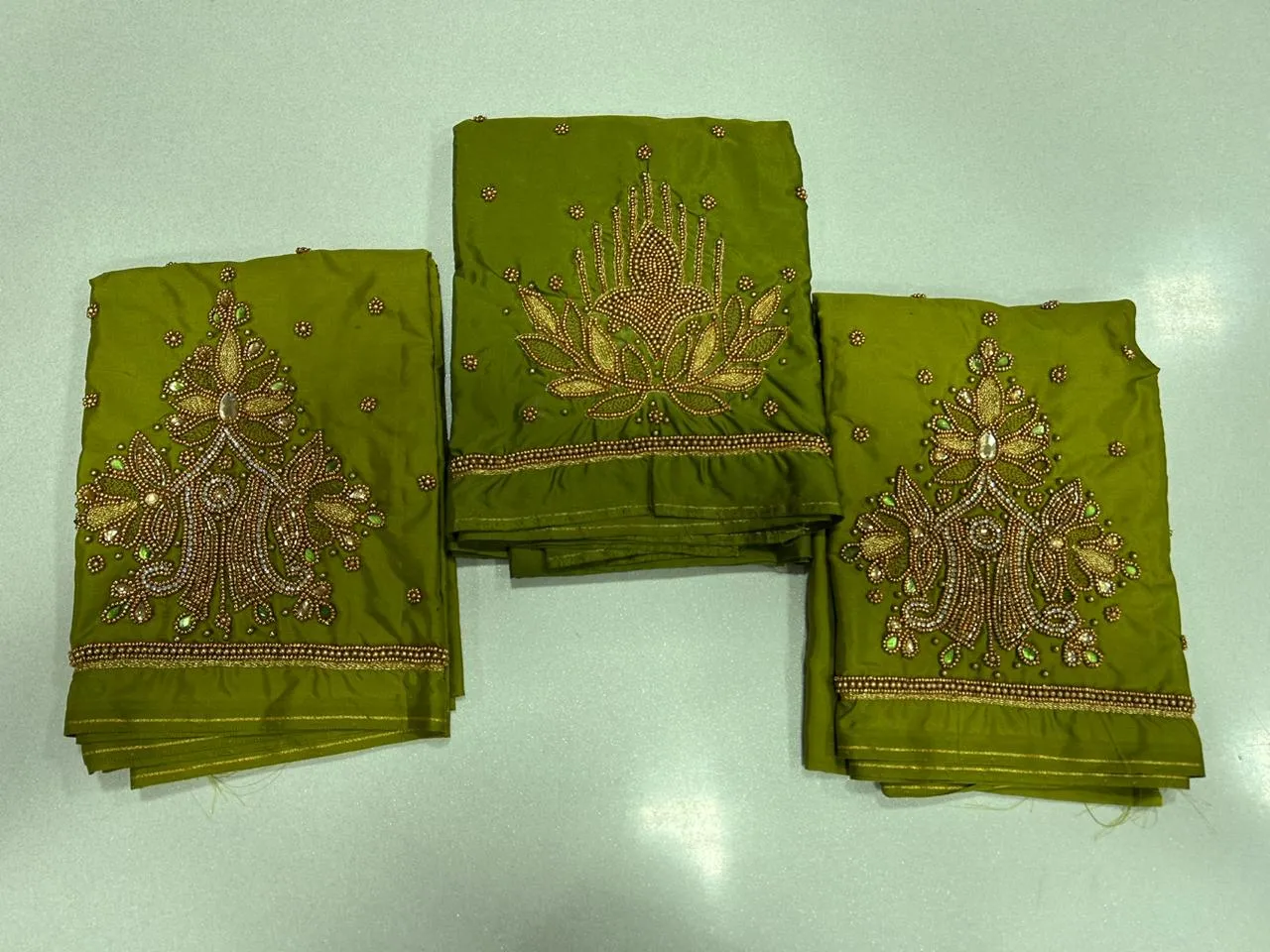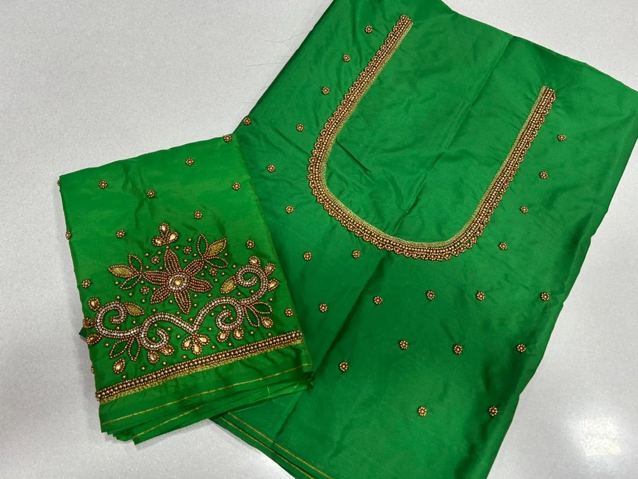 Stunning Green Raw Silk with Aari Work blouse. Crafted for wedding and festive wear, pairs beautifully with silk sarees and lehengas.