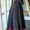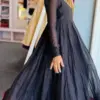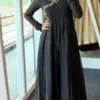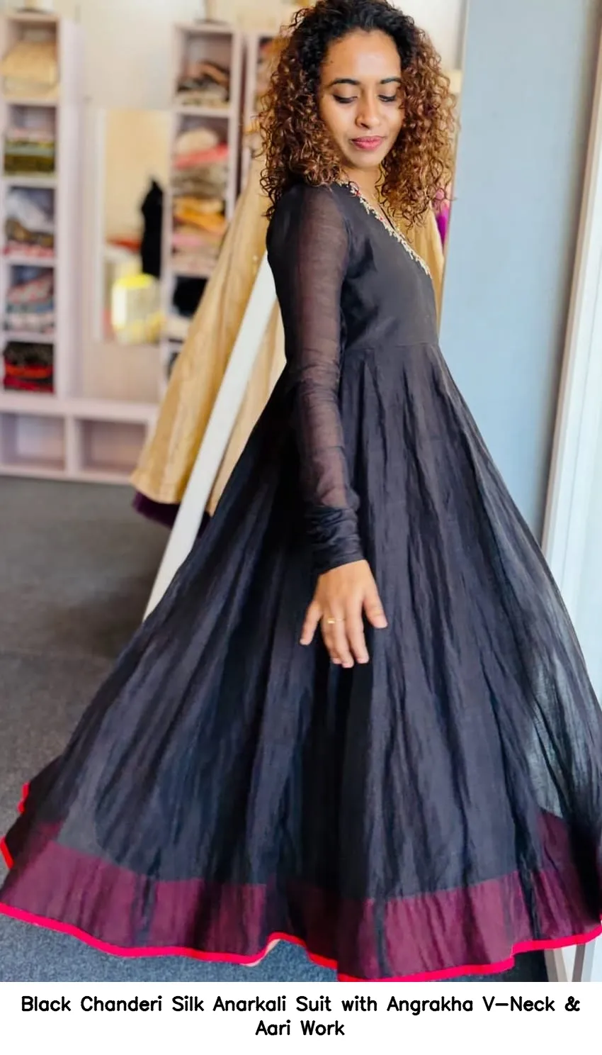 ​​​​Black Chanderi Silk Anarkali Suit with Angrakha V-Neck & Aari Work