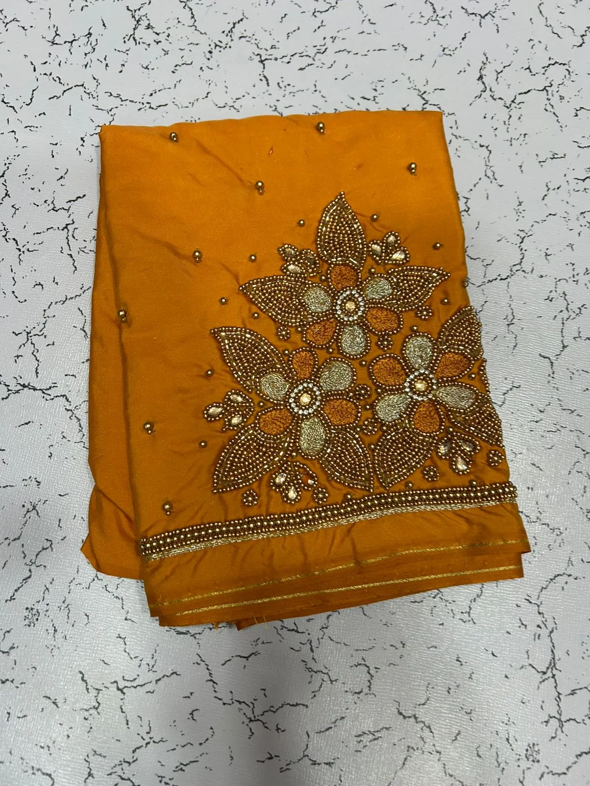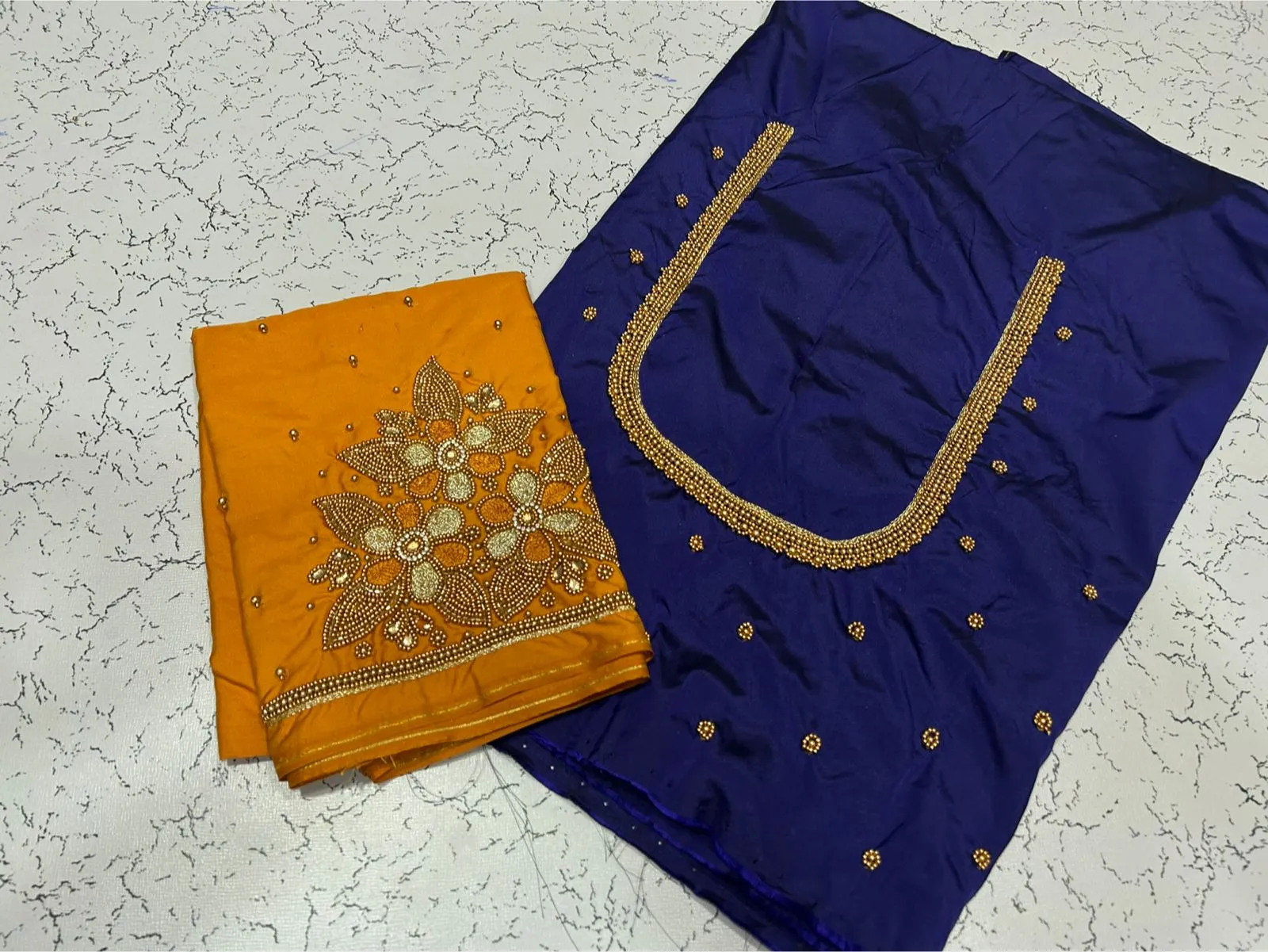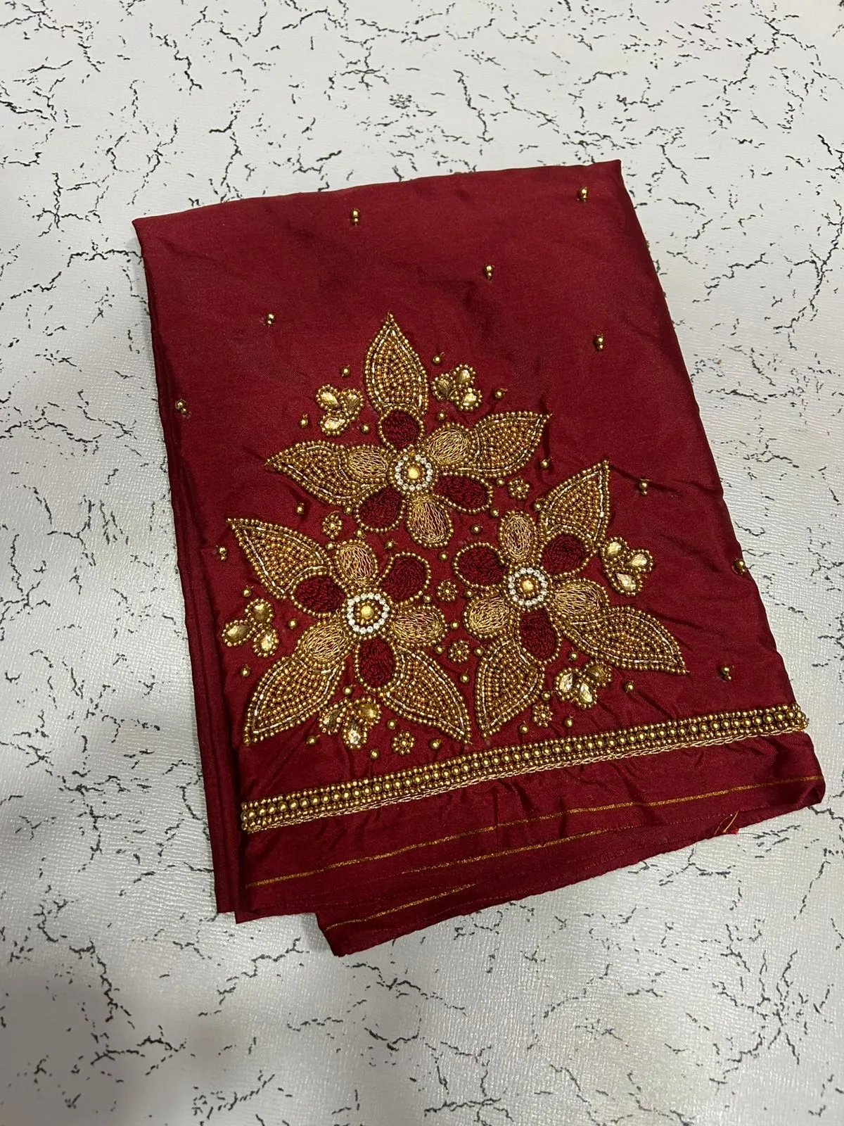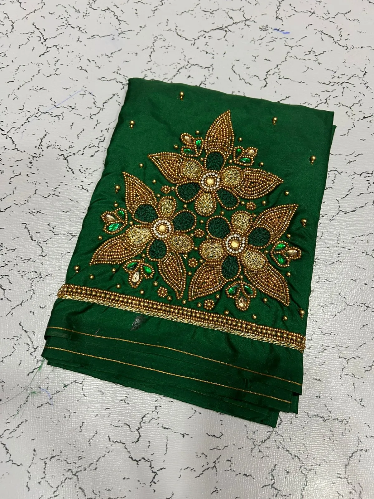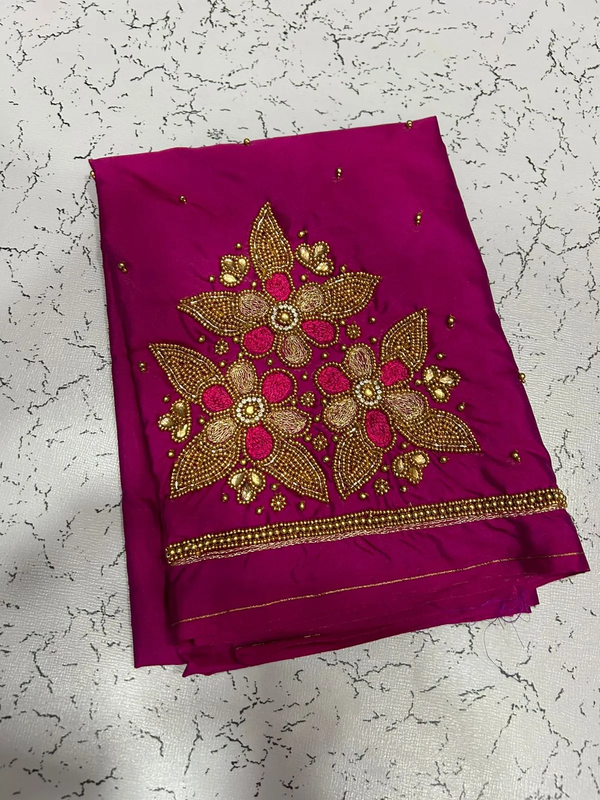 A: This blouse features high-quality fabrics, ensuring durability and comfort. The intricate maggam work and floral beads add a luxurious touch to your ensemble.