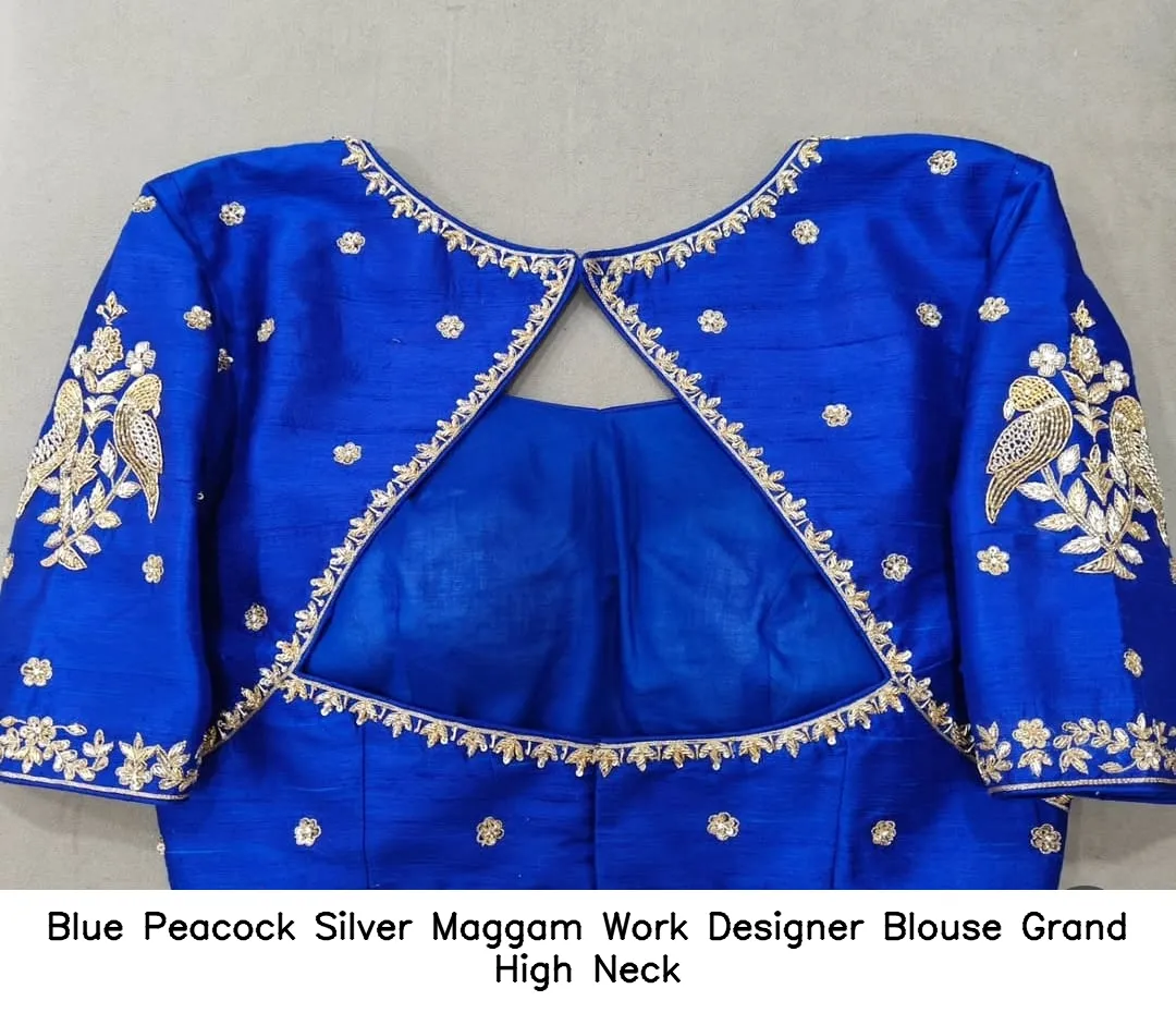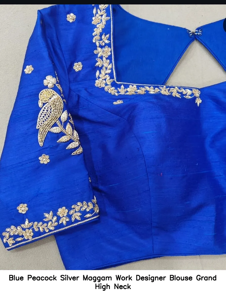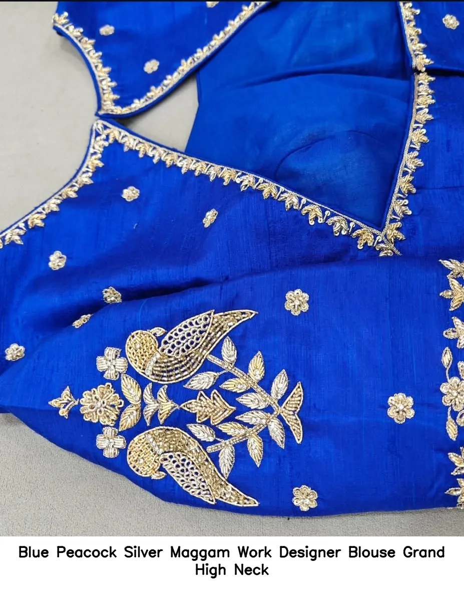 Blue Peacock Silver Maggam Work Designer Blouse – Grand High Neck