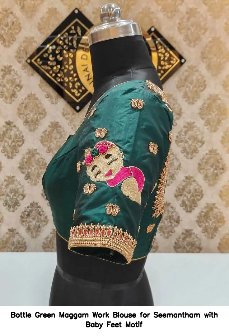 Bottle Green Maggam Work Blouse for Seemantham with Baby Feet Motif