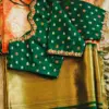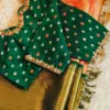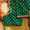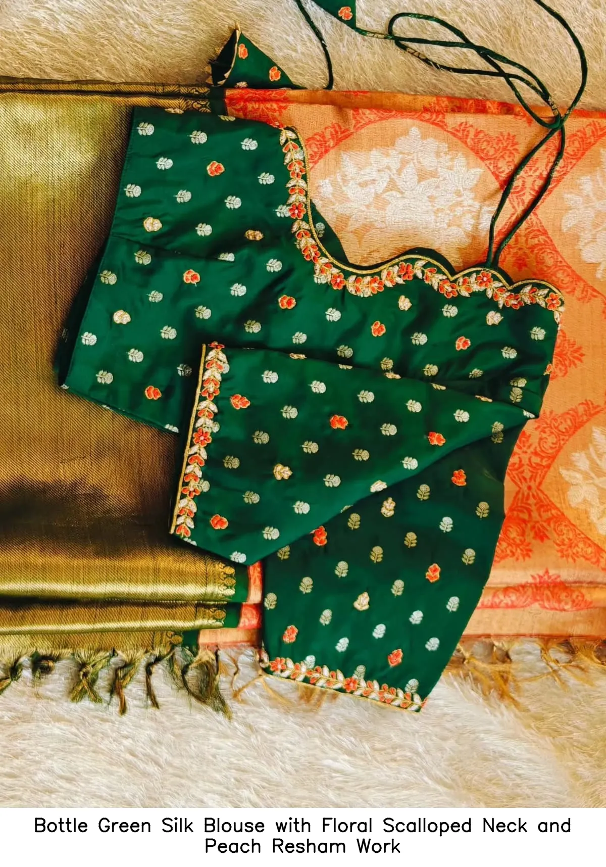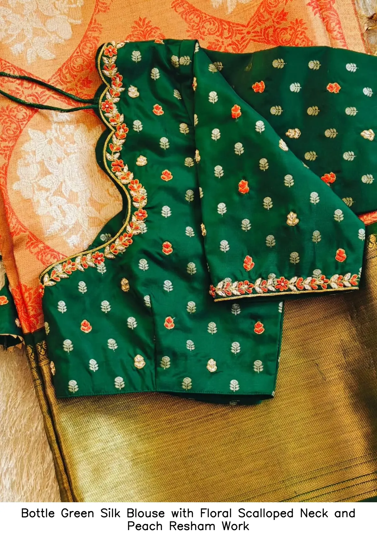 Product Name: Bottle Green Silk Blouse with Floral Scalloped Neck and Peach Resham Work