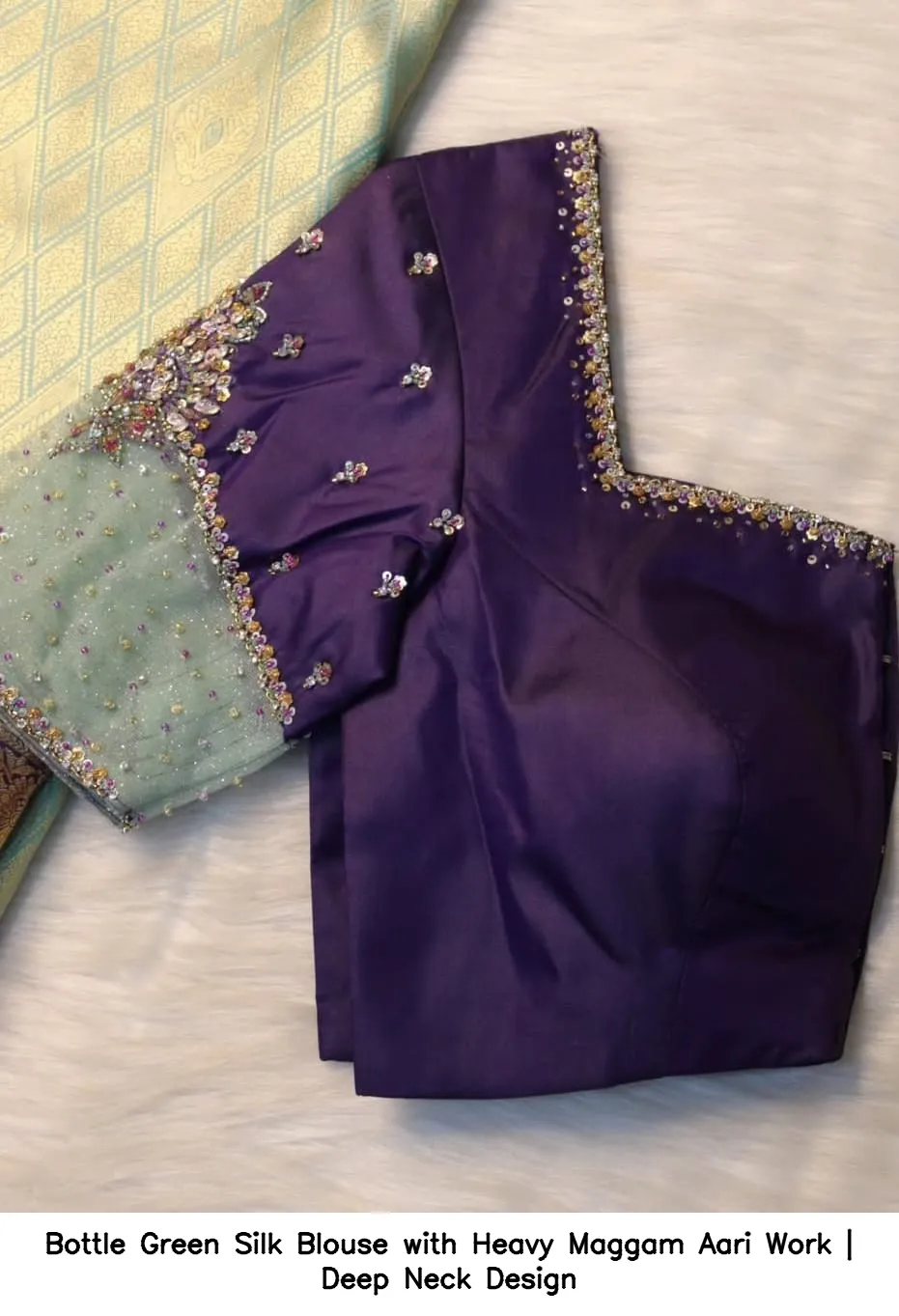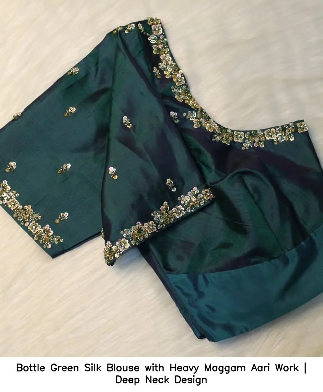 Why Choose Bottle Green Silk Blouse with Heavy Maggam Aari Work | Deep Neck Design?