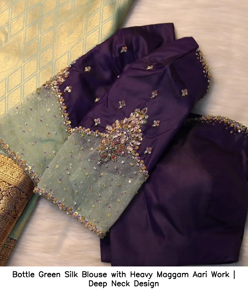Bottle Green Silk Blouse with Heavy Maggam Aari Work | Deep Neck Design Features and Benefits