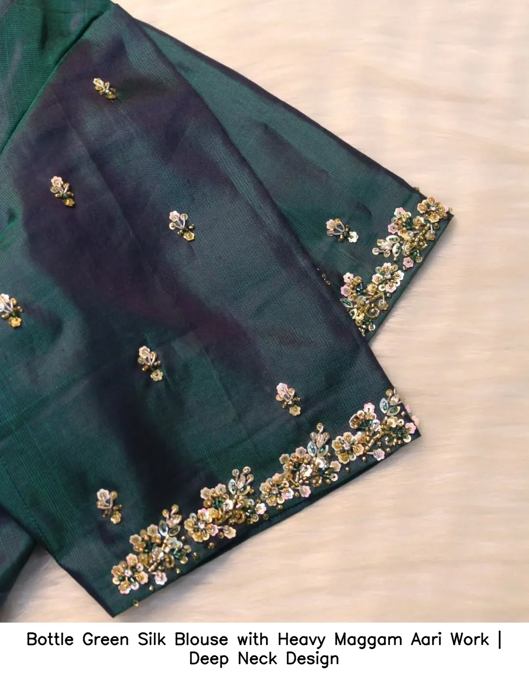 Bottle Green Silk Blouse with Heavy Maggam Aari Work | Deep Neck Design