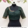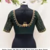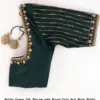 To maintain the elegance of your Bottle Green Silk Blouse with Royal Gold Aari Work – Bridal Maggam Work Blouse with Floral Border & Heavy Striped Sleeves, dry clean only. Avoid direct sunlight and store in a cool, dry place to preserve the fabric and embellishments.