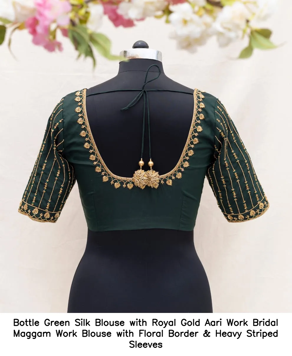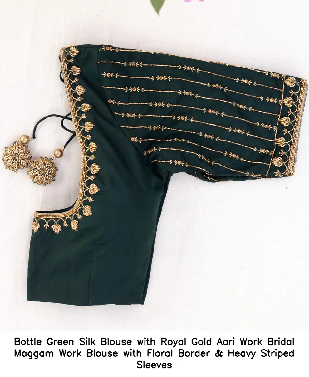 Bottle Green Silk Blouse with Royal Gold Aari Work – Bridal Maggam Work Blouse with Floral Border & Heavy Striped Sleeves