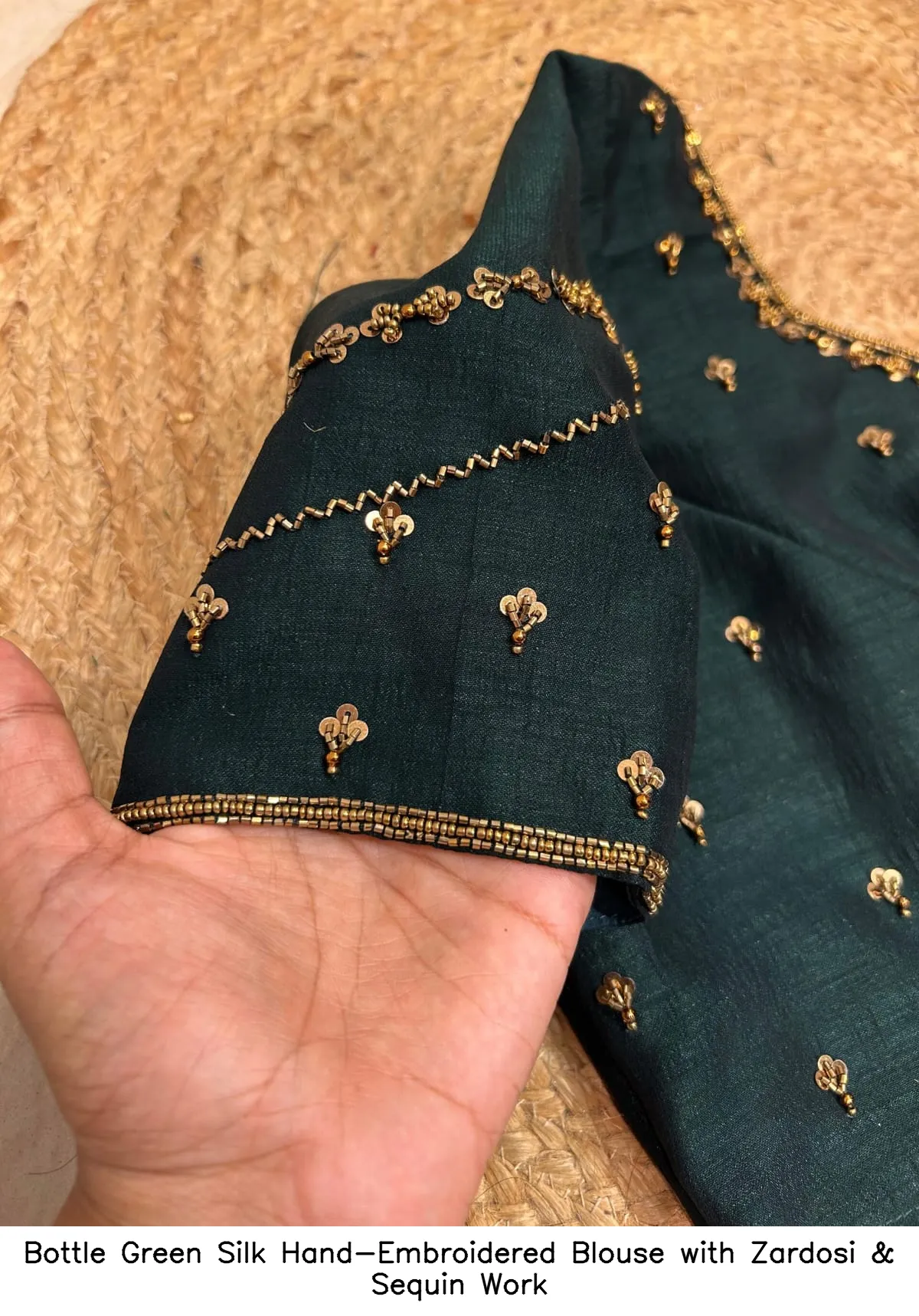 Introducing the exquisite Bottle Green Silk Hand-Embroidered Blouse with Zardosi & Sequin Work. This stunning piece combines elegance and tradition. Perfect for special occasions, it adds a touch of sophistication to your wardrobe.