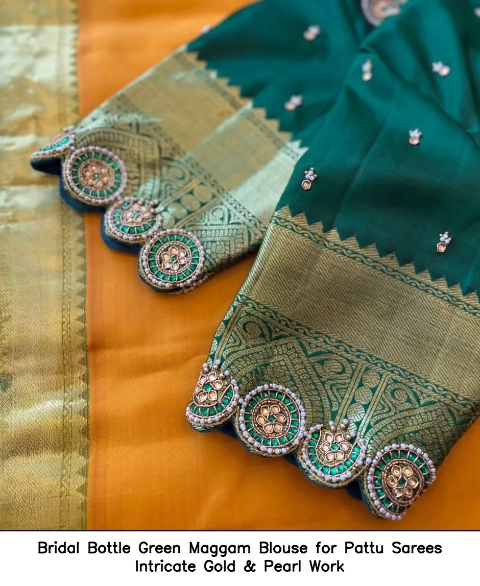 Bridal Bottle Green Maggam Blouse for Pattu Sarees – Intricate Gold & Pearl Work