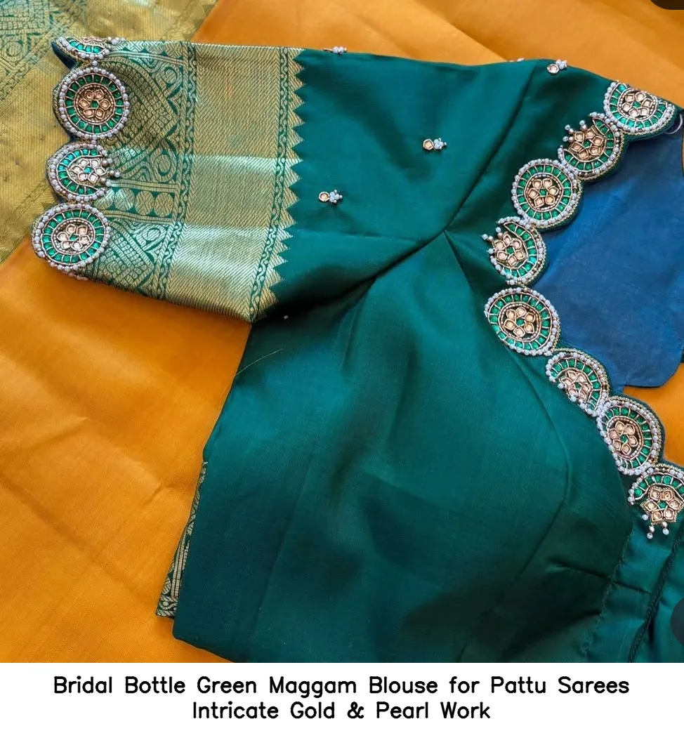 Product Name: Bridal Bottle Green Maggam Blouse for Pattu Sarees – Intricate Gold & Pearl Work