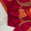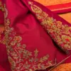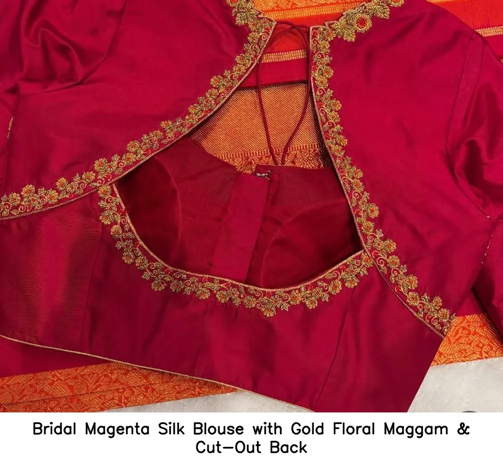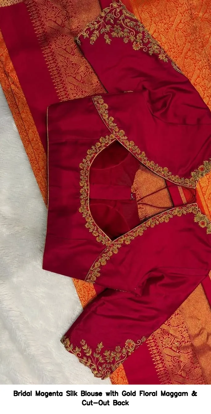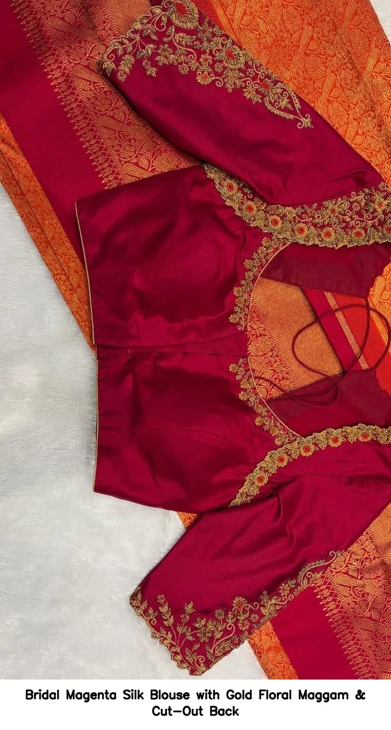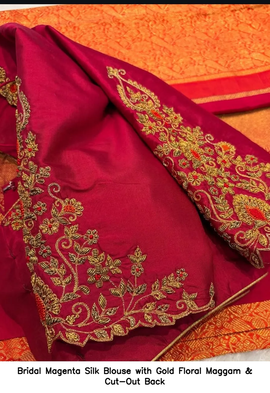 Product Name: Bridal Magenta Silk Blouse with Gold Floral Maggam & Cut-Out Back