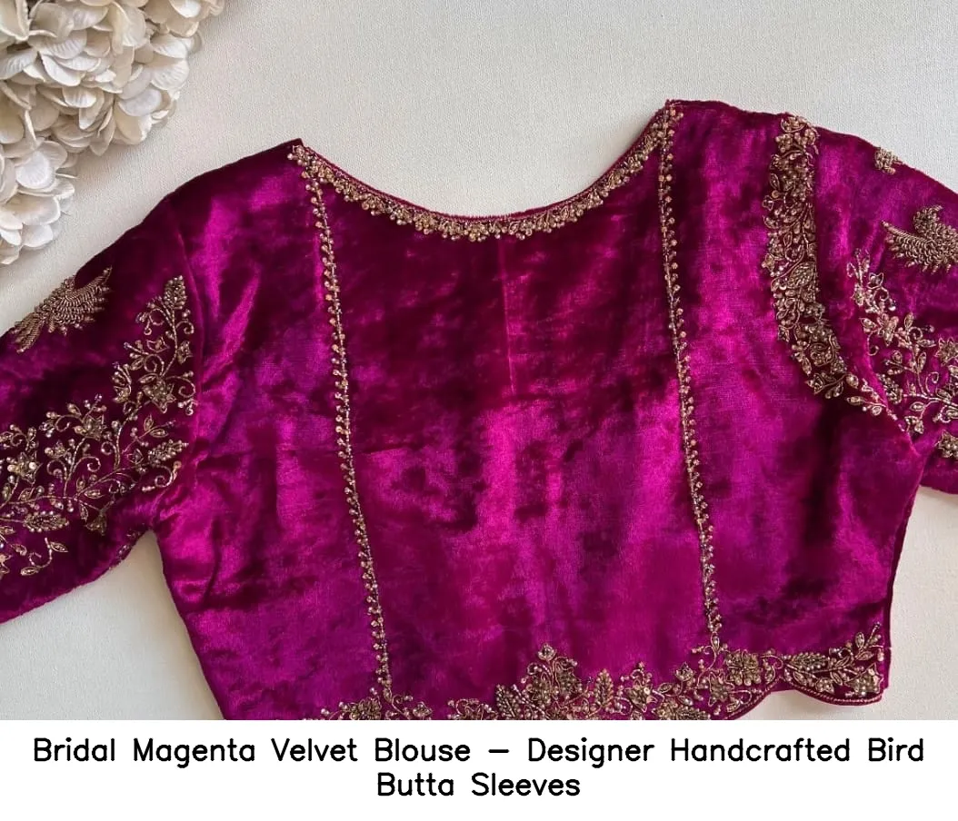 Product Name: ​​​Bridal Magenta Velvet Blouse – Designer Handcrafted Bird Butta Sleeves