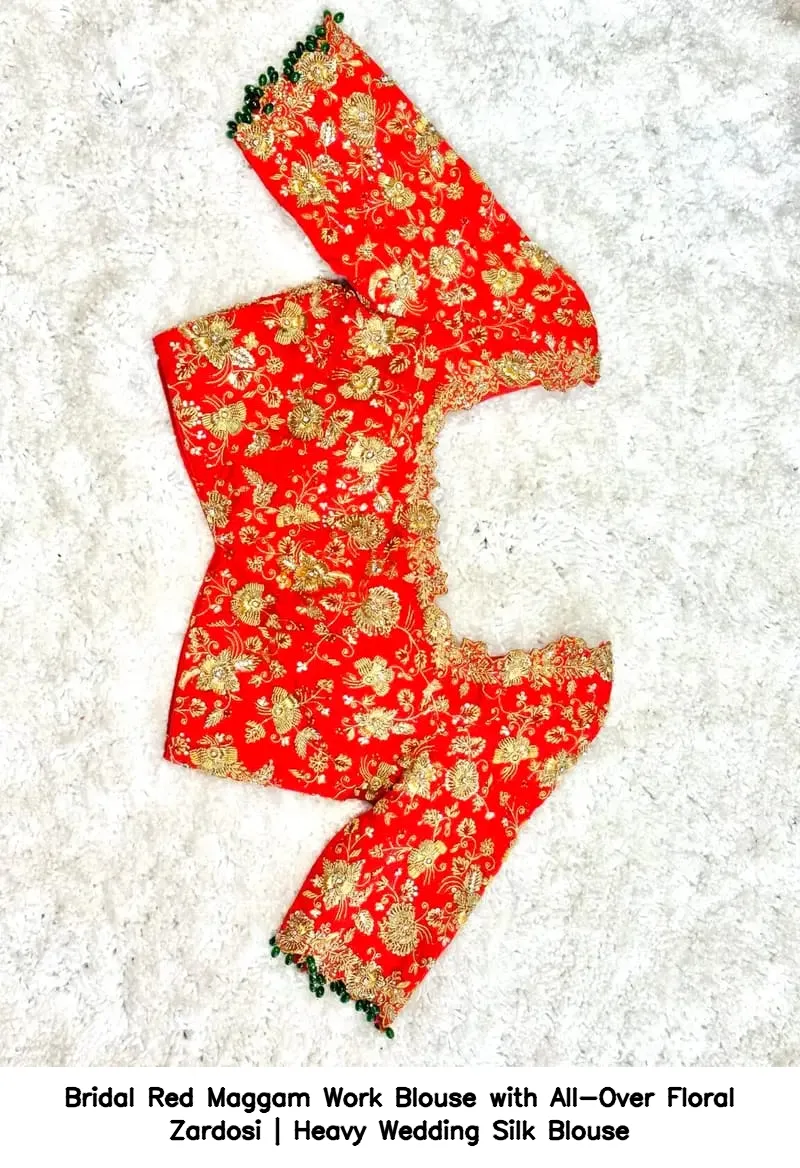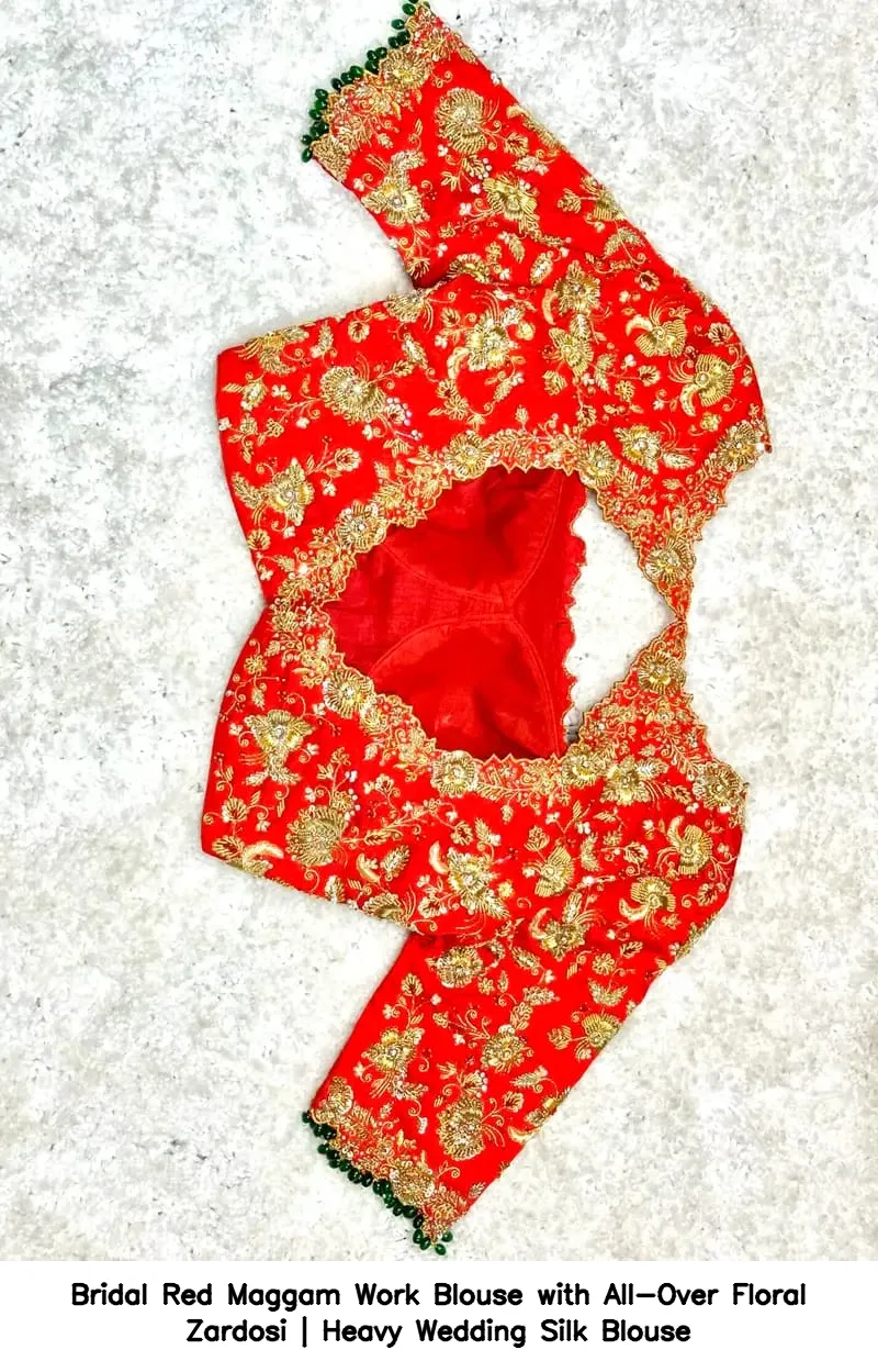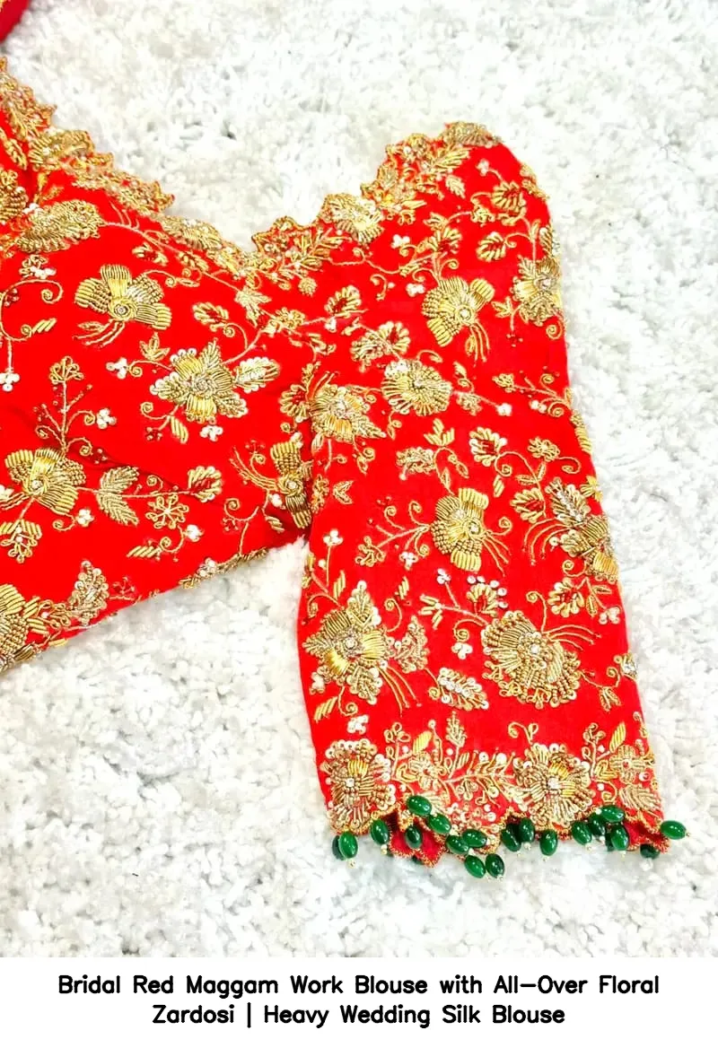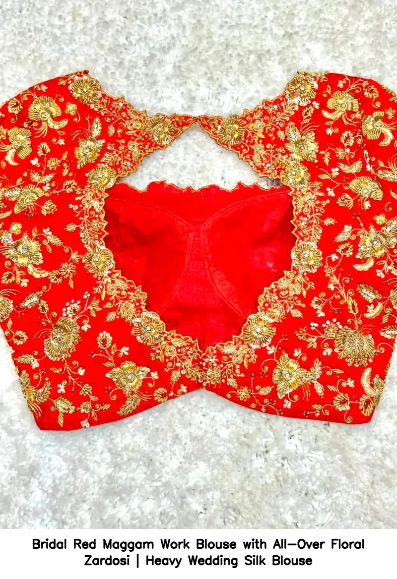 - Product Name: Bridal Red Maggam Work Blouse with All-Over Floral Zardosi | Heavy Wedding Silk Blouse