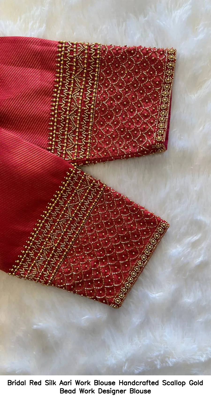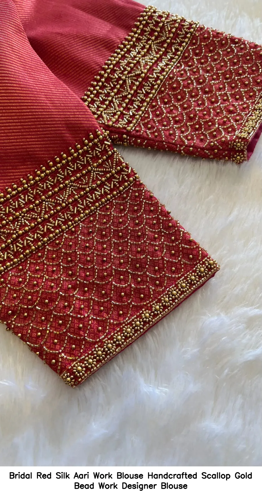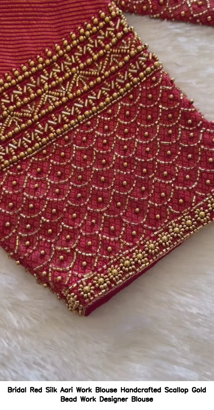 ​​​​Bridal Red Silk Aari Work Blouse – Handcrafted Scallop Gold Bead Work Designer Blouse