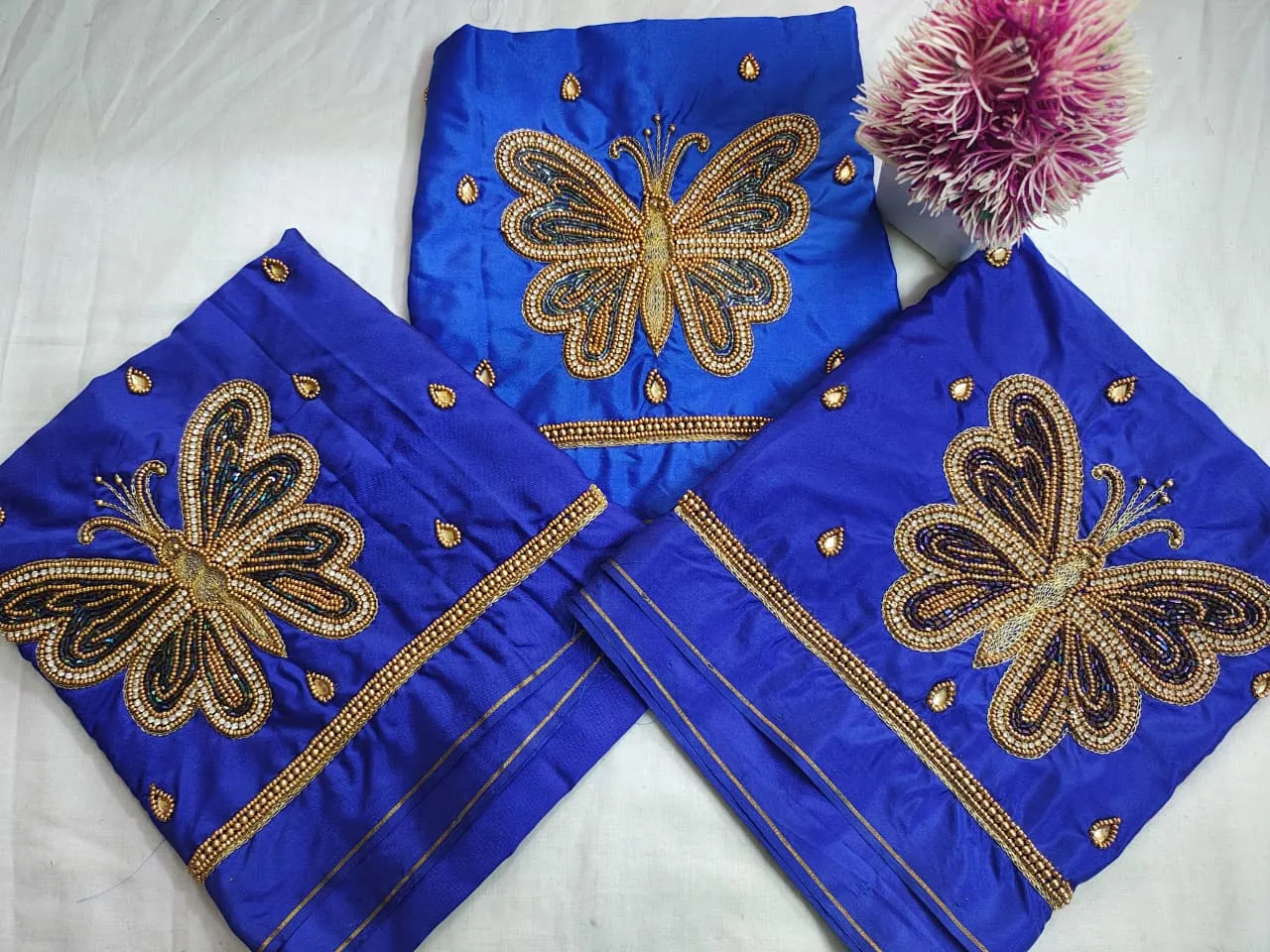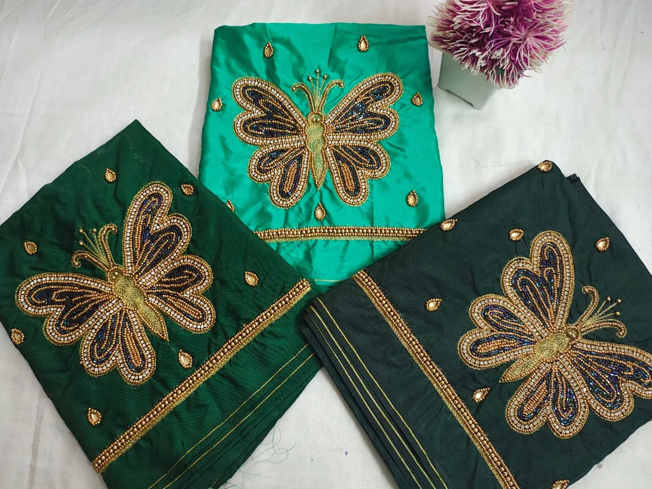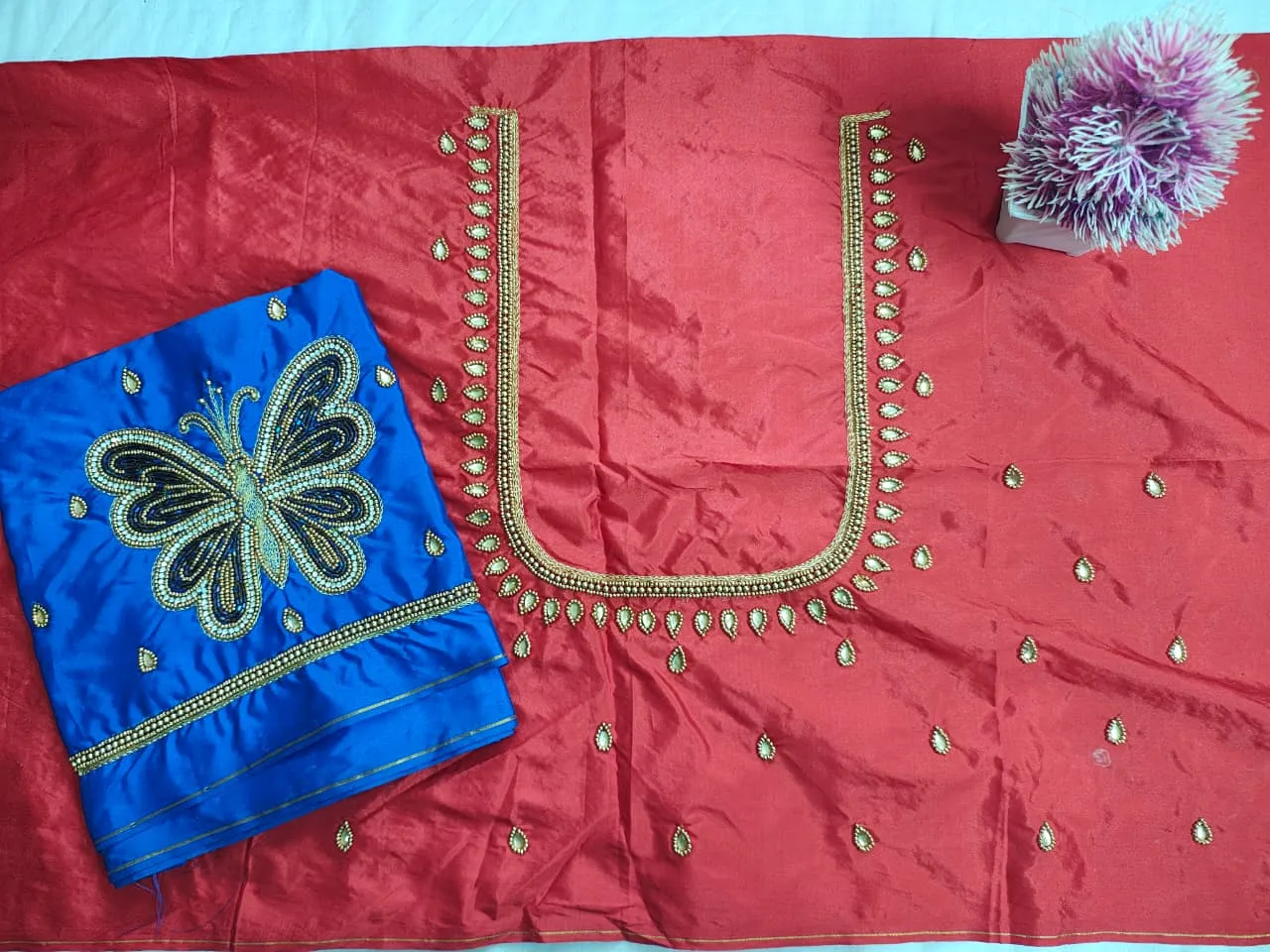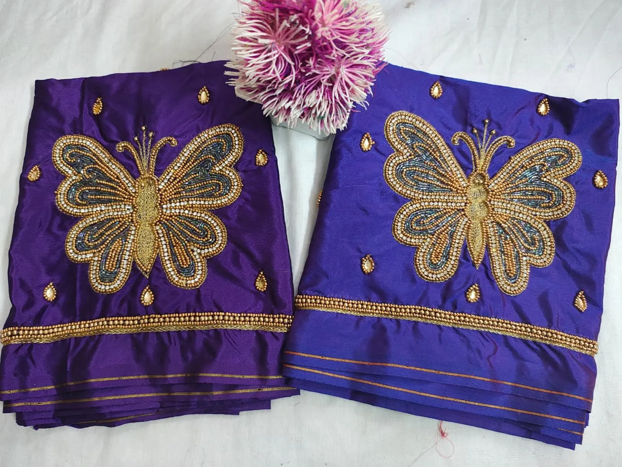 The Budget-Friendly Maggam Work Blouse with Stunning Gold Butterfly Buti Design is available in raw silk and cotton. Sizes include XL, XXL, and 3XL. You can choose from vibrant colors like red, pink, green, maroon, wine, yellow, purple, and brown. To see more options, browse our collection.