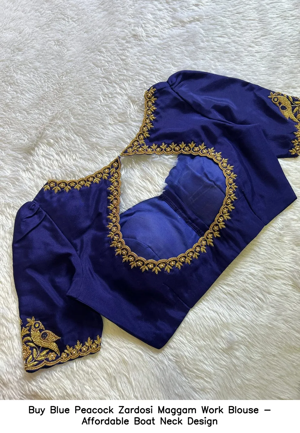 Buy Blue Peacock Zardosi Maggam Work Blouse – Affordable Boat Neck Design Features and Benefits