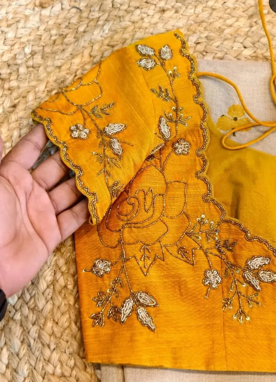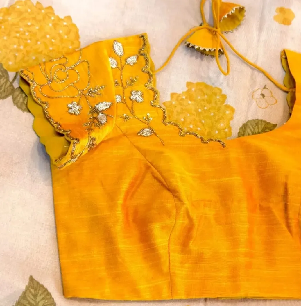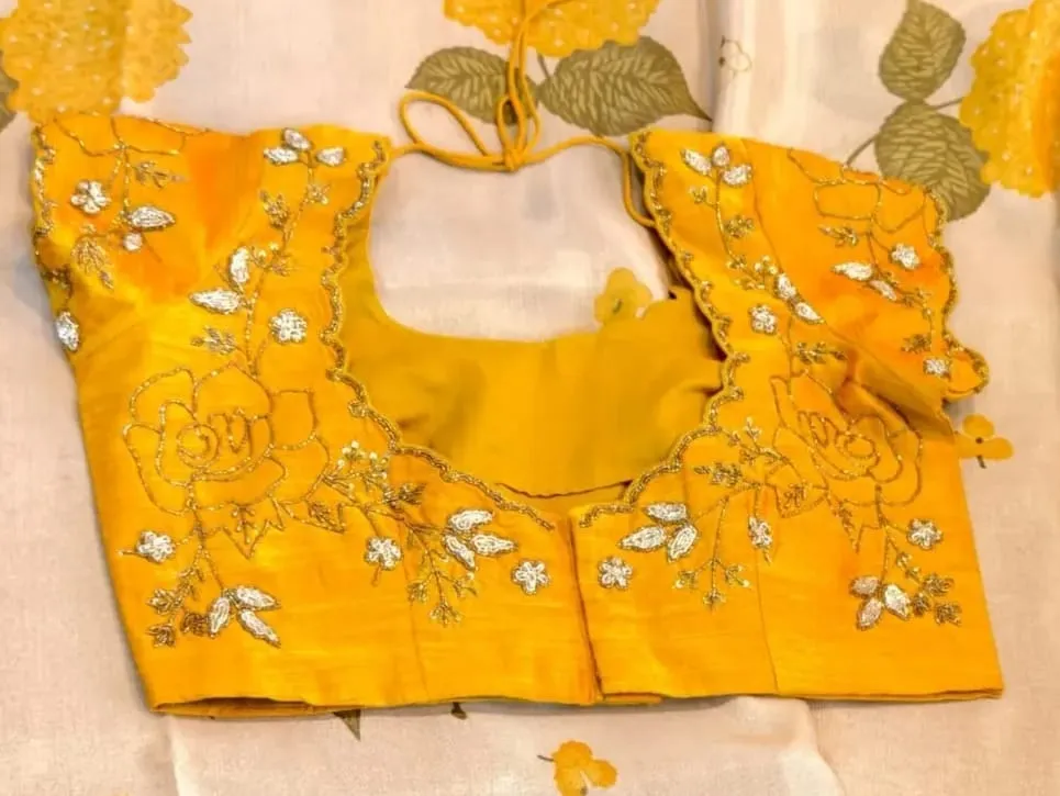 The blouse features intricate floral Maggam work. It comes in multiple sizes and colors. For more options, browse our collection.