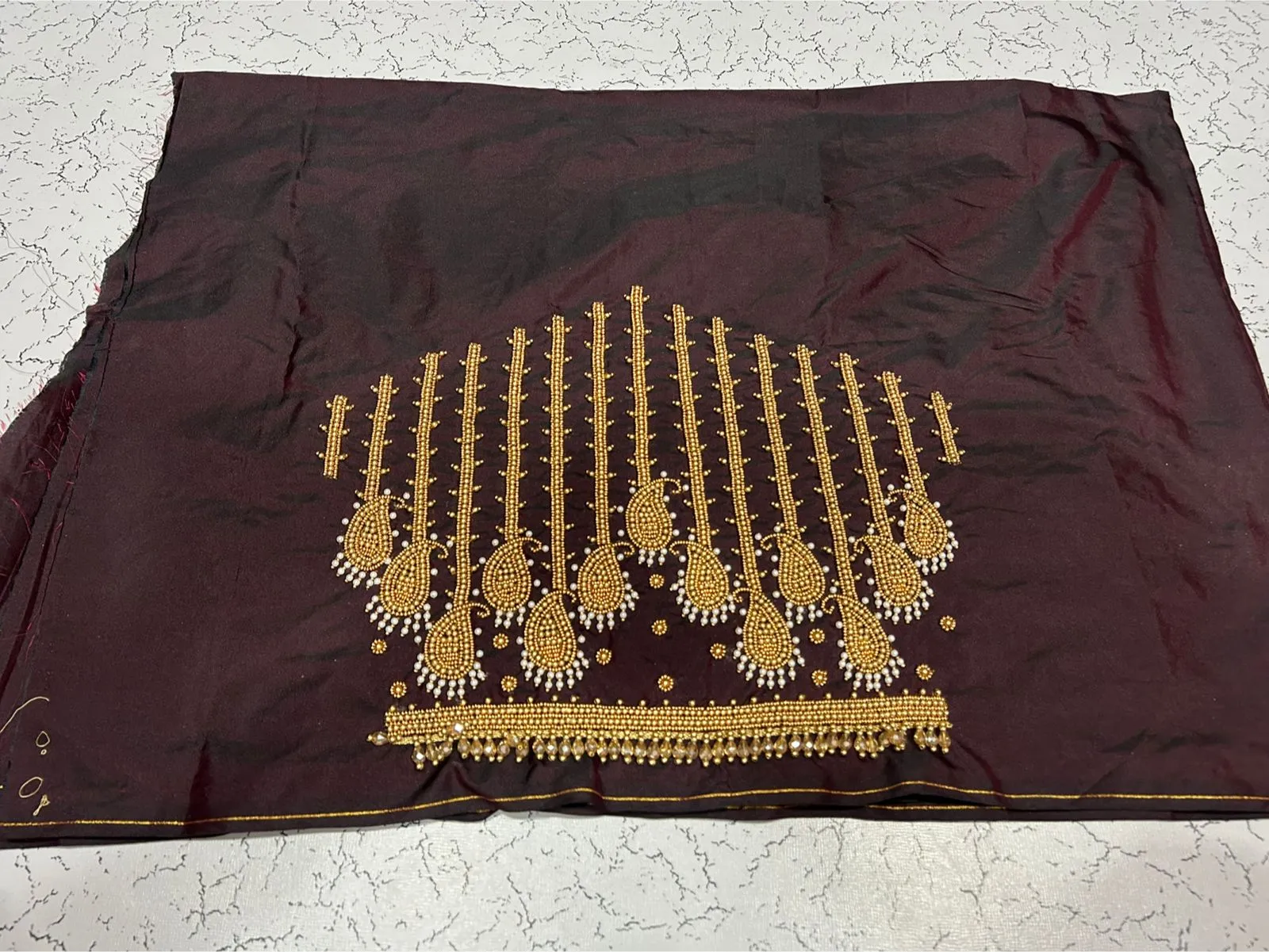 Stunning Raw Silk with Aari Work blouse. Crafted for bridal wear, pairs beautifully with silk sarees and lehengas.