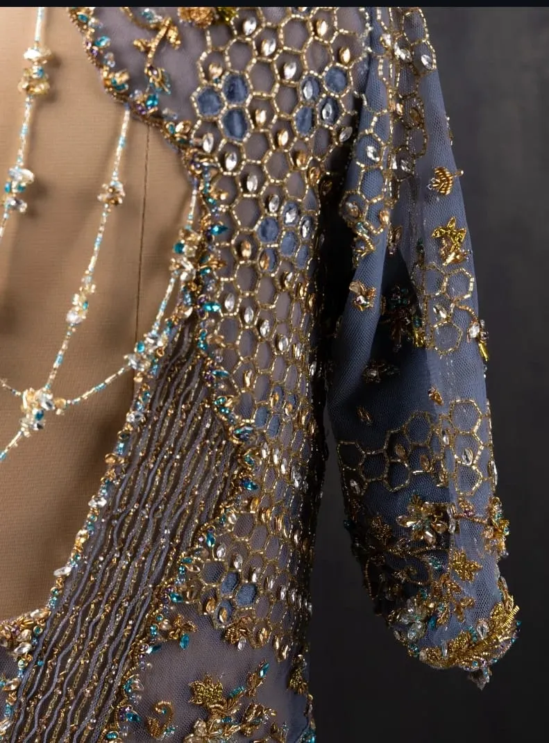Stunning Blue Net with Maggam Work blouse. Crafted for bridal wear, pairs beautifully with silk sarees and lehengas.
