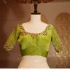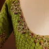 To maintain the beauty of your Chartreuse Bridal Silk Blouse – Heavy Hand-Embroidered Grid Sleeve Blouse for Weddings, hand wash in cold water and hang to dry. Avoid harsh detergents and direct sunlight to preserve its vibrant color and intricate embroidery.