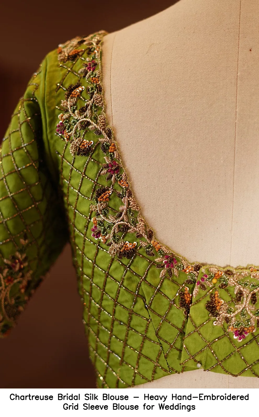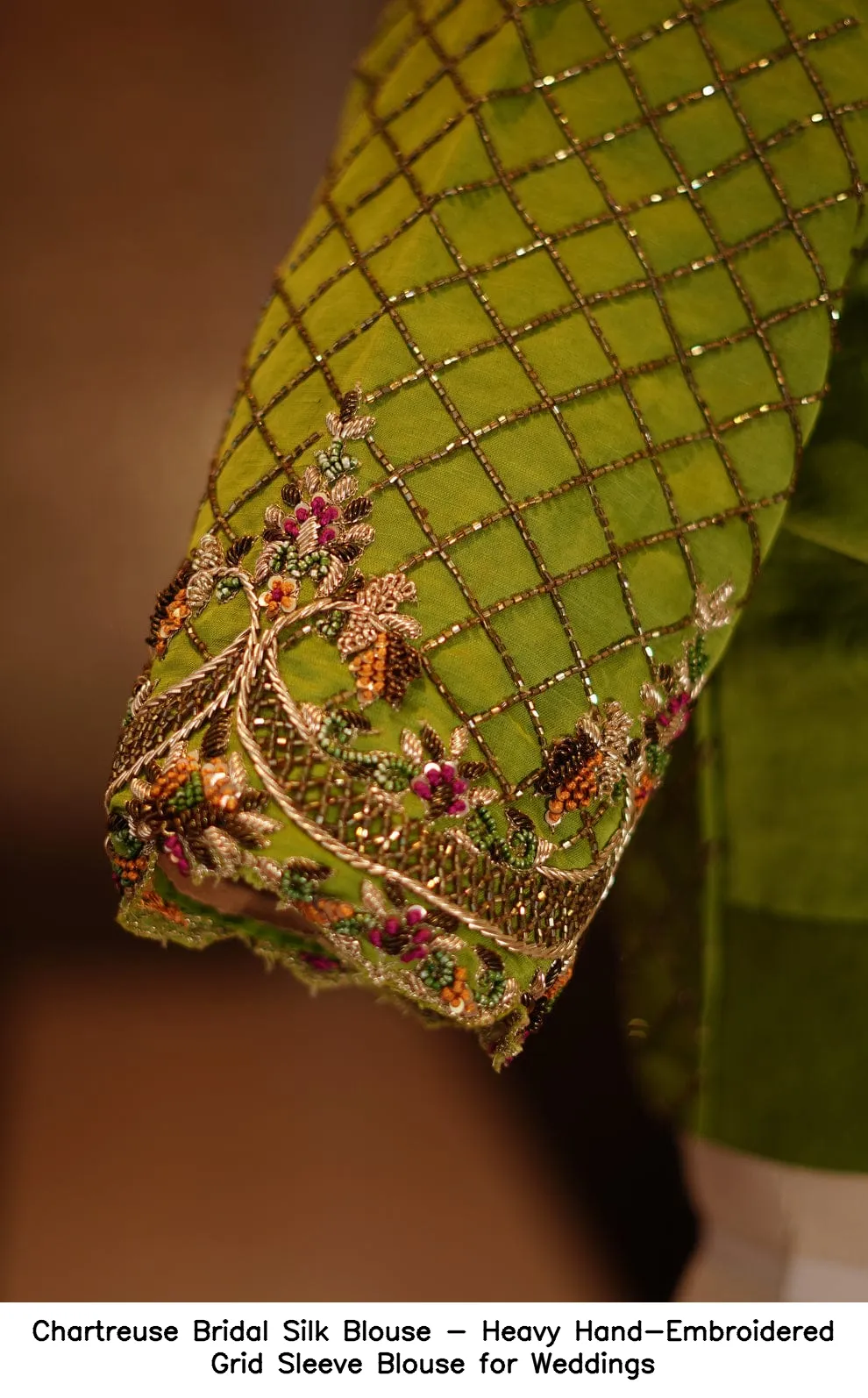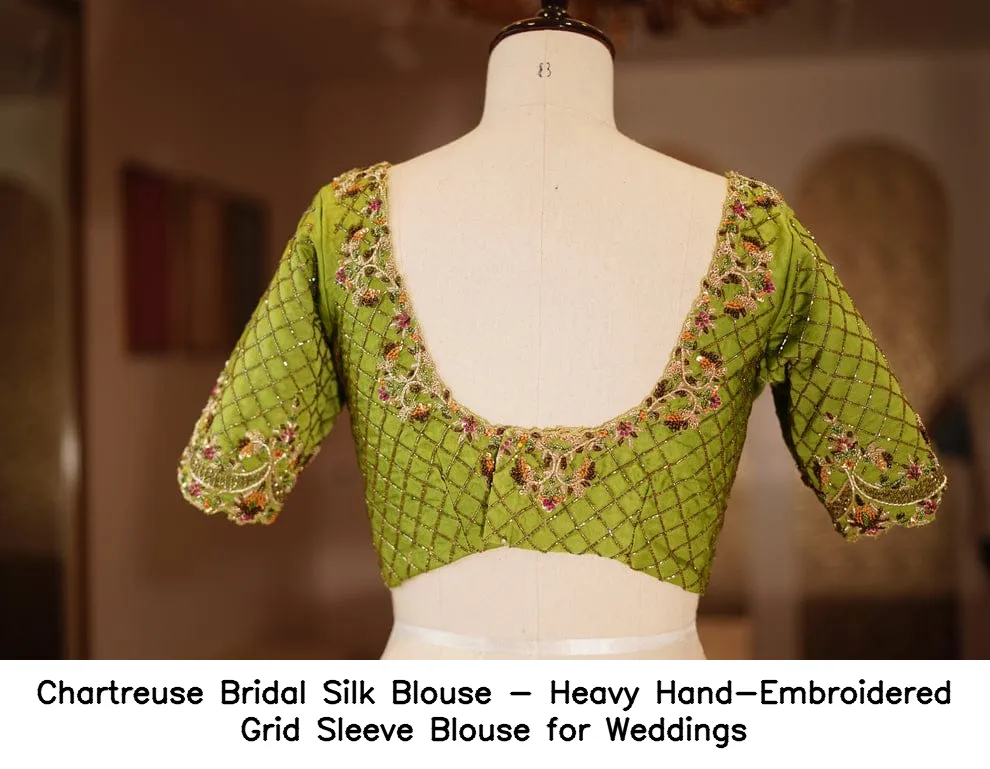 Chartreuse Bridal Silk Blouse – Heavy Hand-Embroidered Grid Sleeve Blouse for Weddings