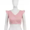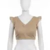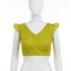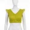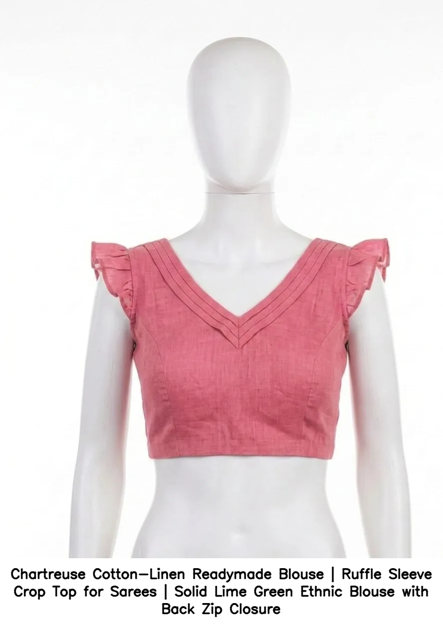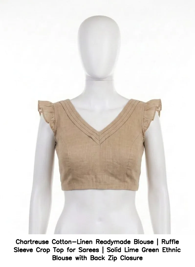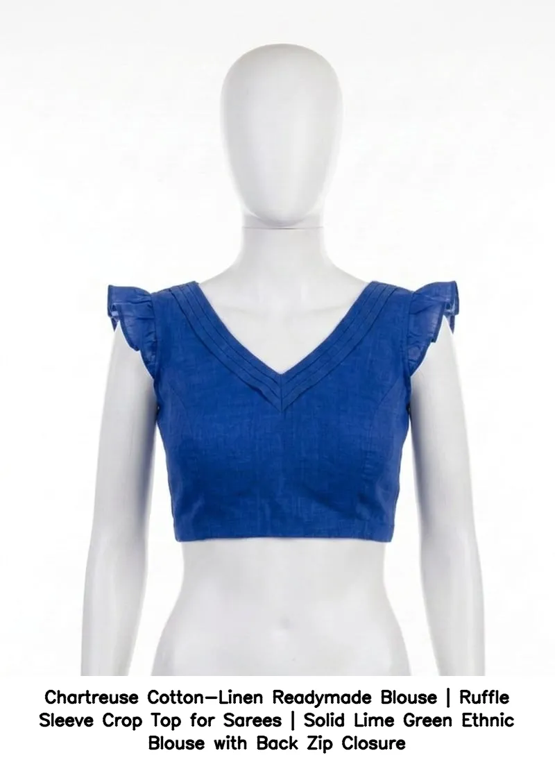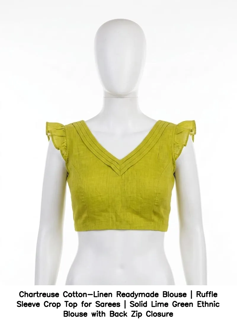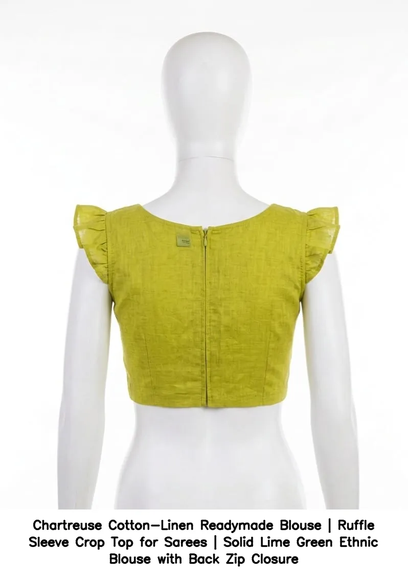 Product Name: Chartreuse Cotton-Linen Readymade Blouse | Ruffle Sleeve Crop Top for Sarees | Solid Lime Green Ethnic Blouse with Back Zip Closure