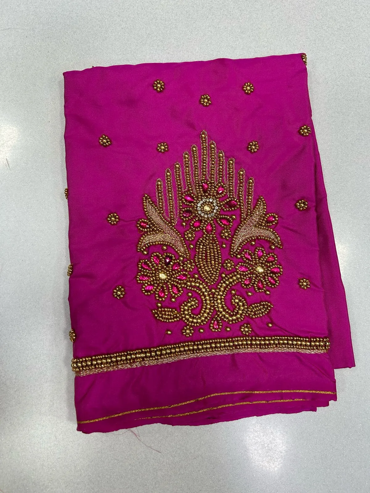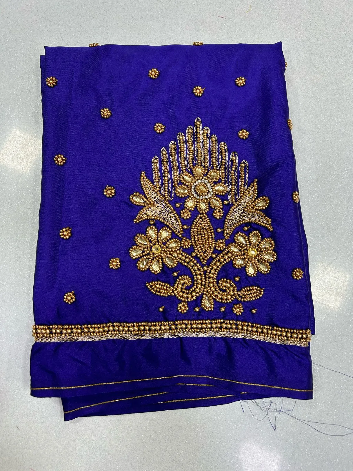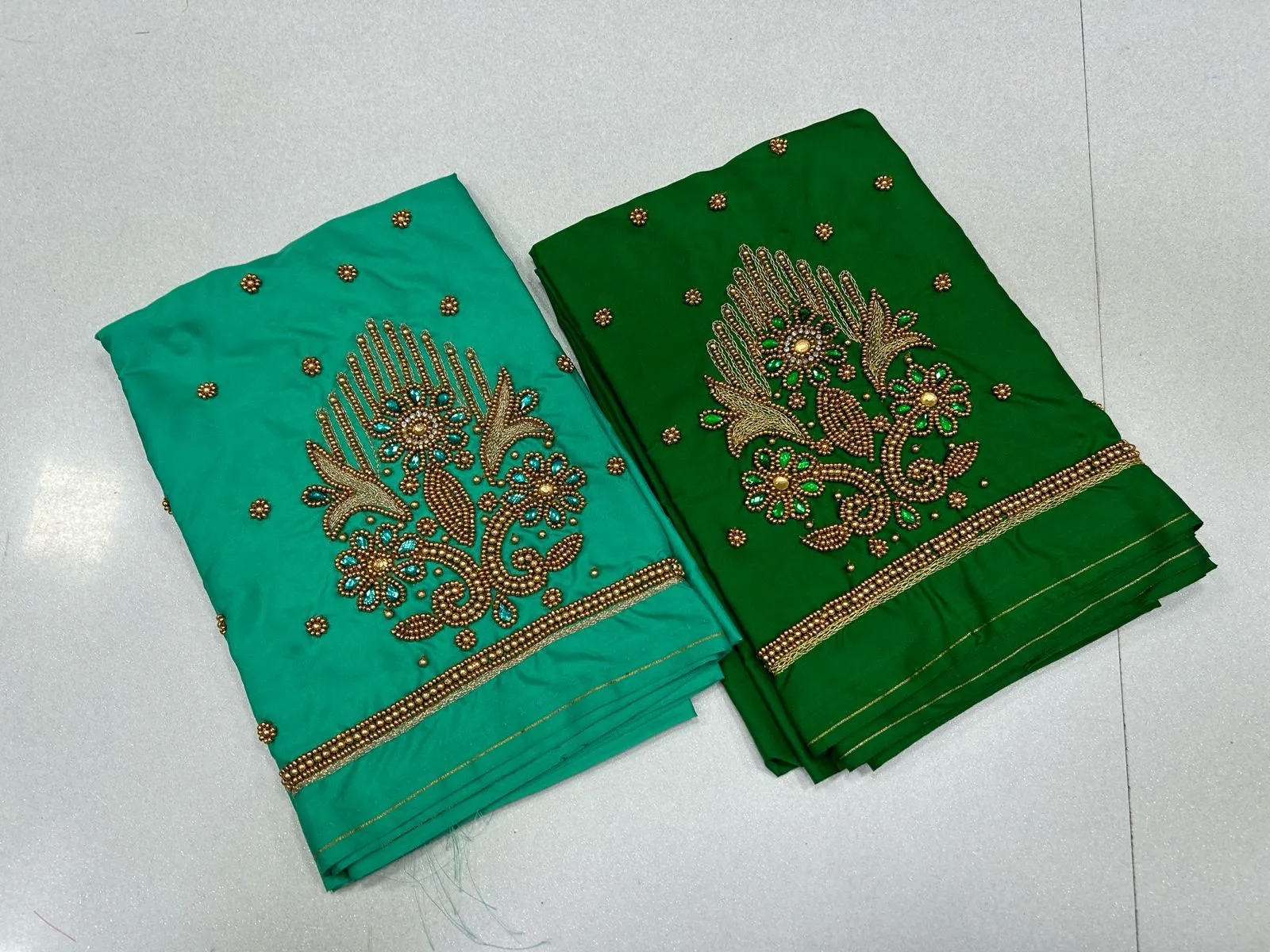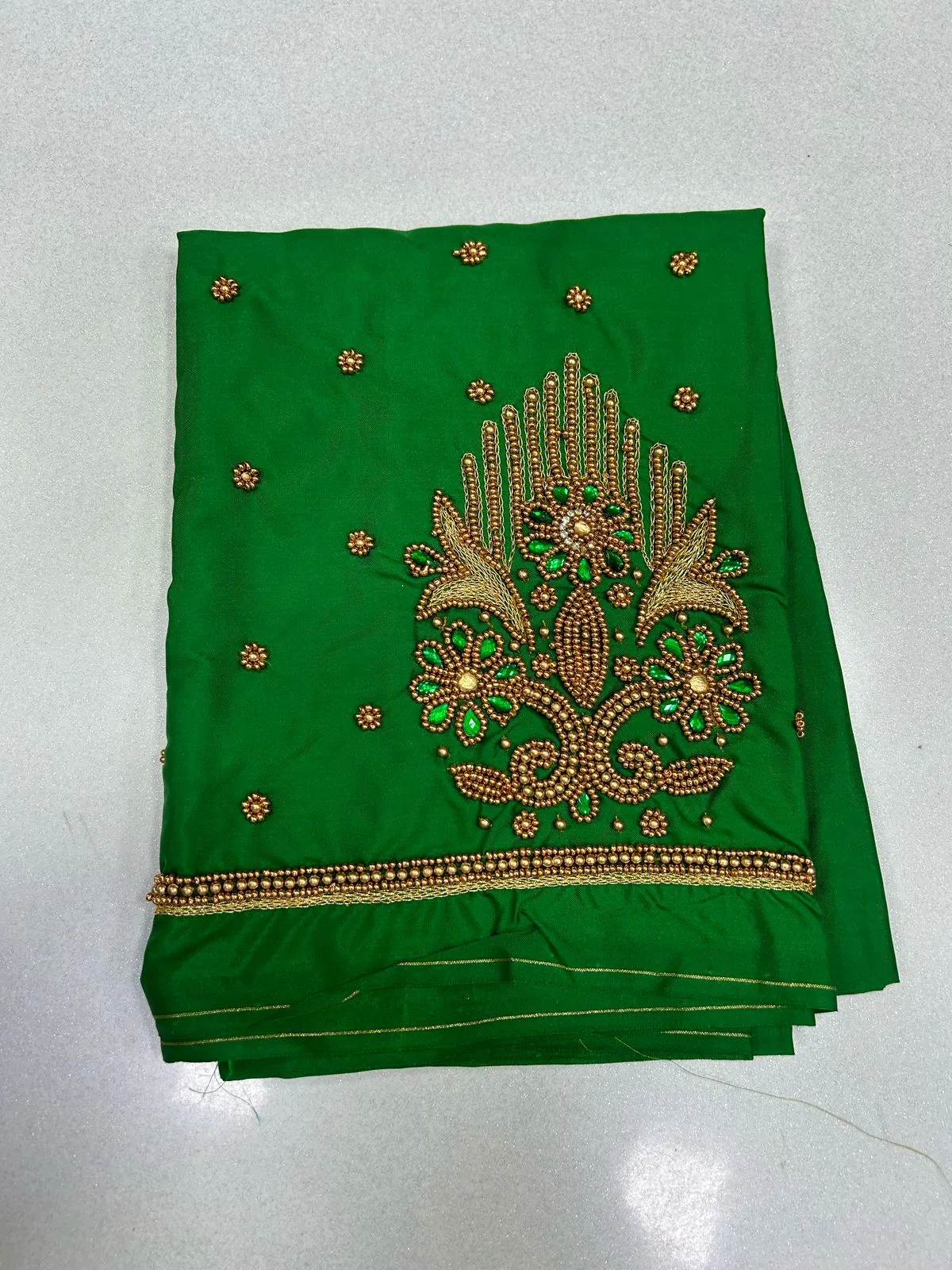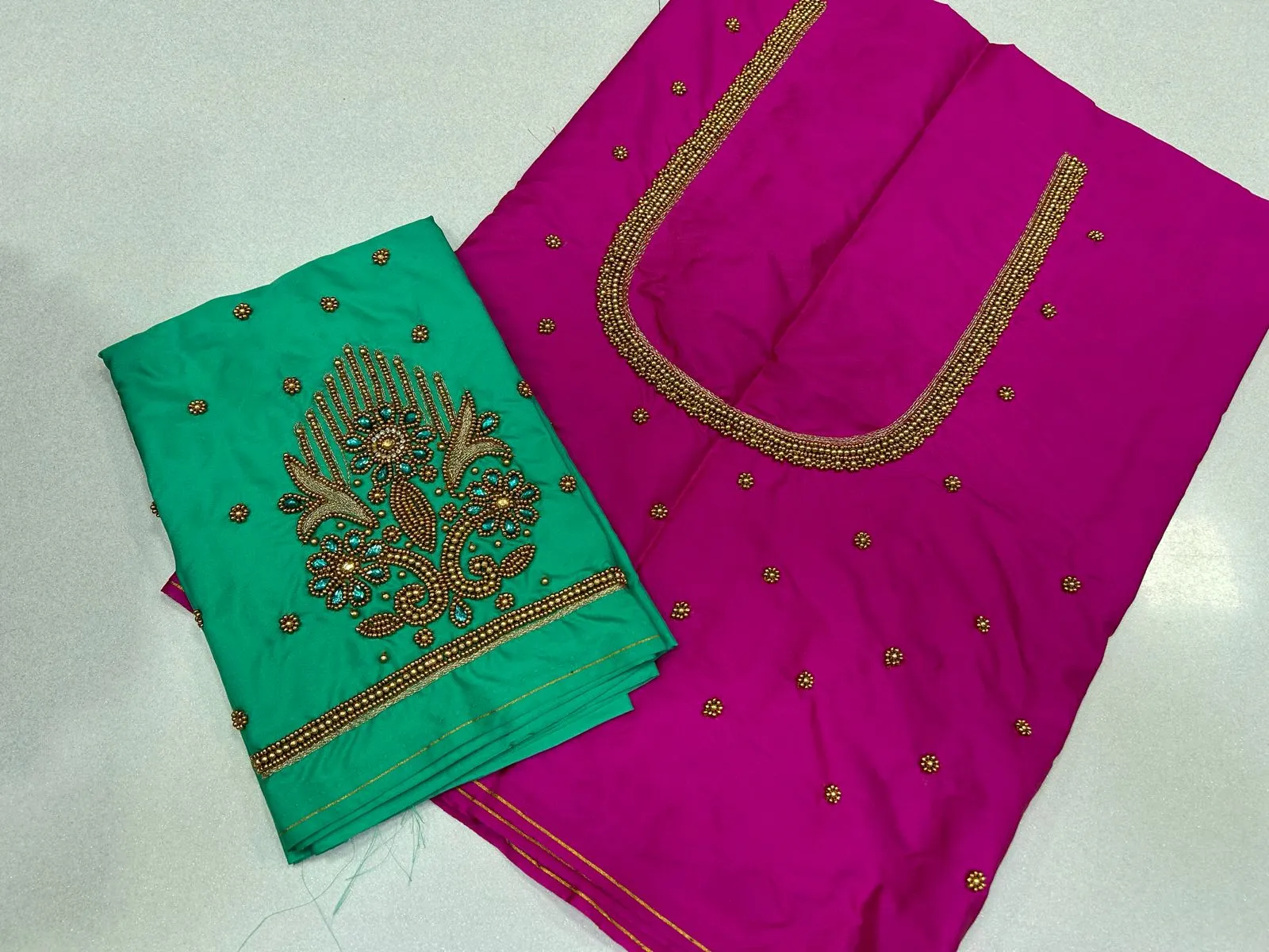 This beautiful blouse is made from raw silk and cotton silk. It comes in various sizes: 32, 34, 36, 38, 40, 42, 44, and 46. You can choose from a stunning range of colors: Blue, Black, Red, Green, Pink, Yellow, Lavender, and Gold. To explore more options, browse our collection.