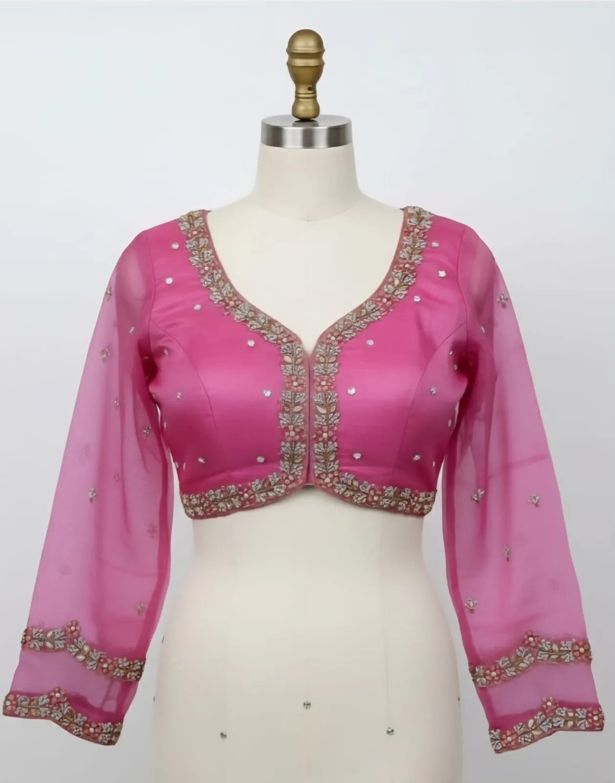 Product Name: Chic Pink Maggam Blouse for Sarees Custom Size Perfection at Best Price Price Per Pc: 3500 INR Fabric Details: Raw Silk Half pattu Size: Xl, XXL, 3XL Colors: Red, Pink,Blue ,Purple, wine ,