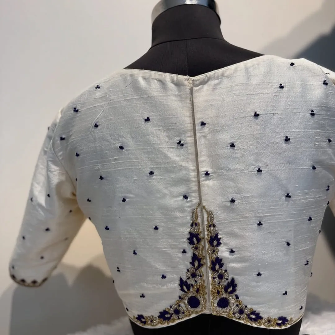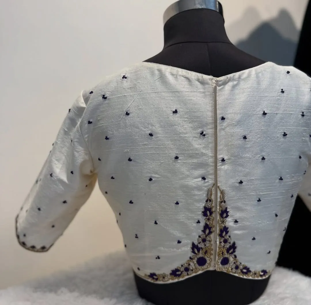 Product Name: Chic TraditionalHalf White Raw Silk Maggam Work Blouse Latest Cut)