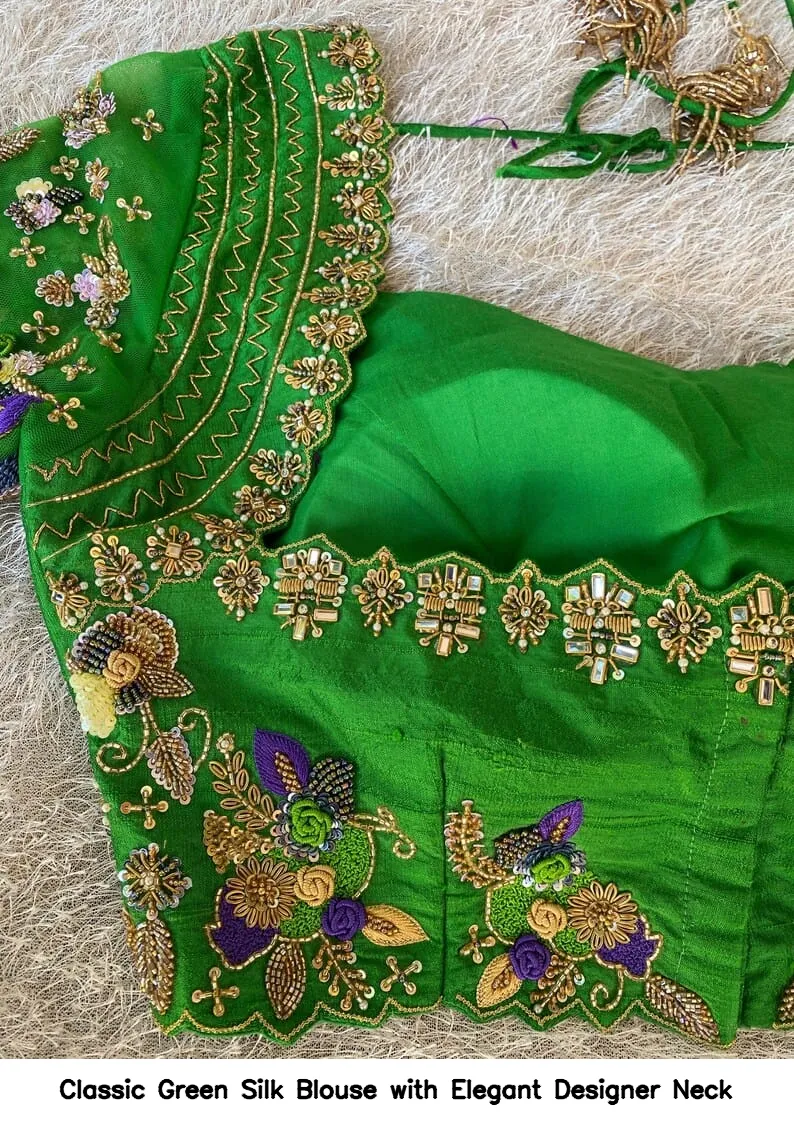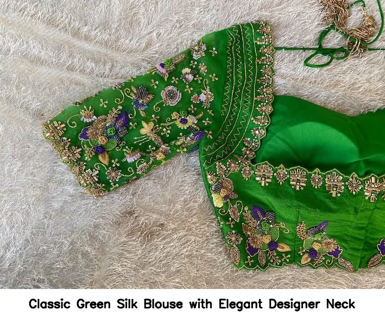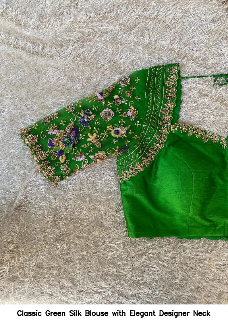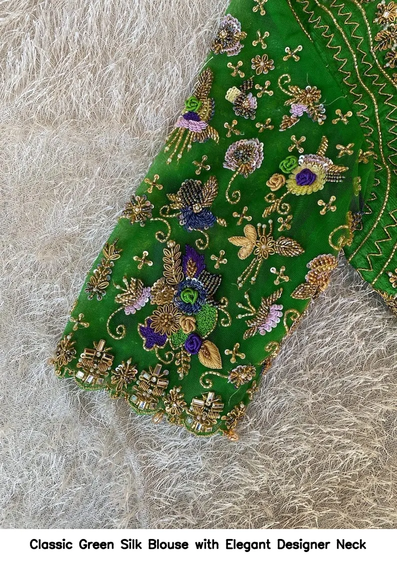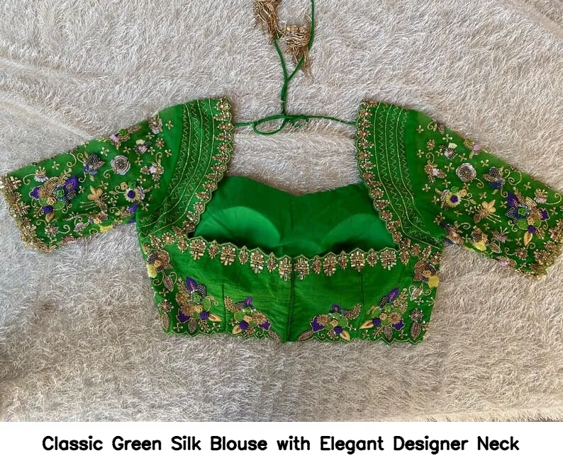 Stunning Green Silk blouse. Crafted for wedding and festive wear, pairs beautifully with silk sarees and lehengas.