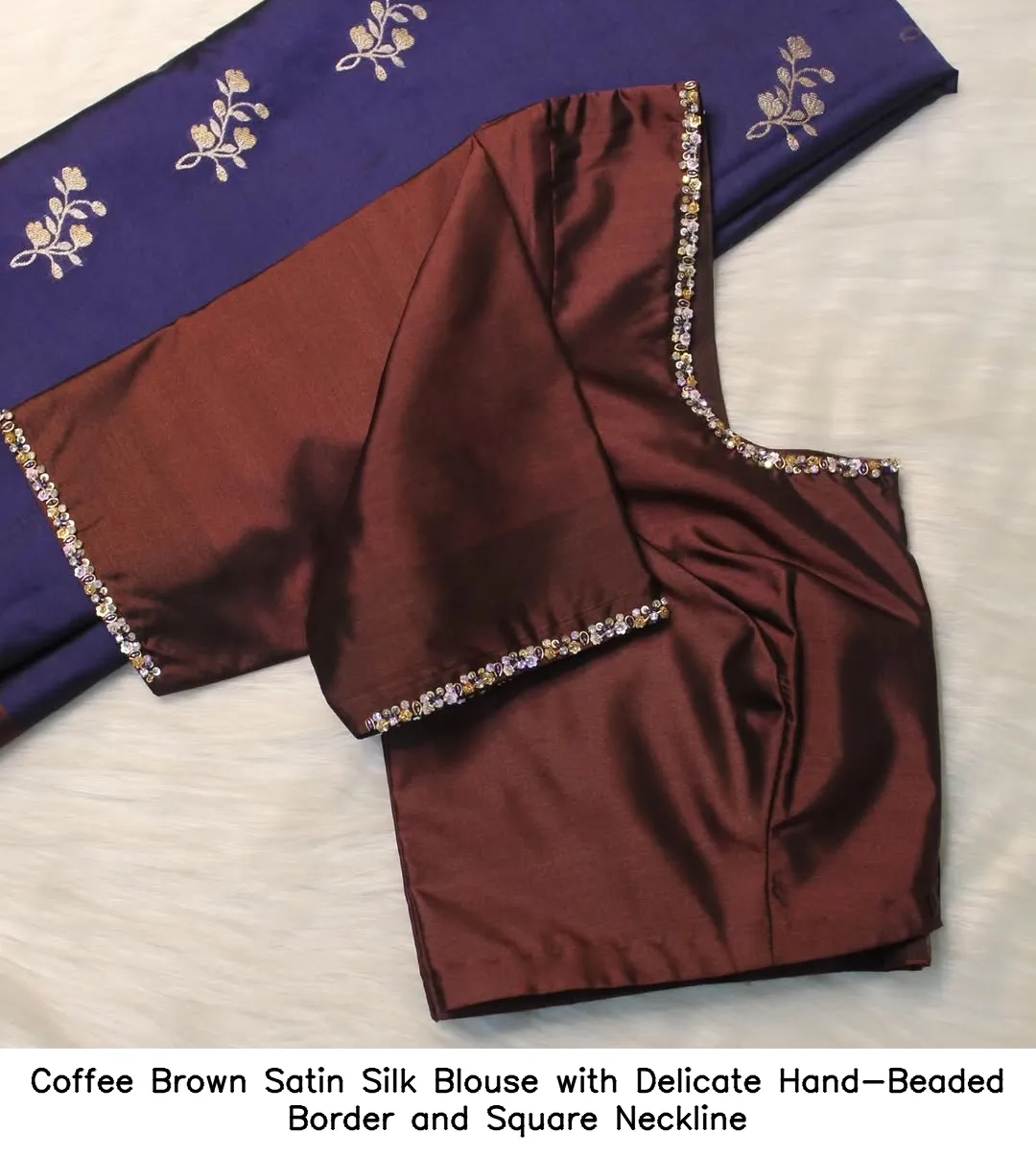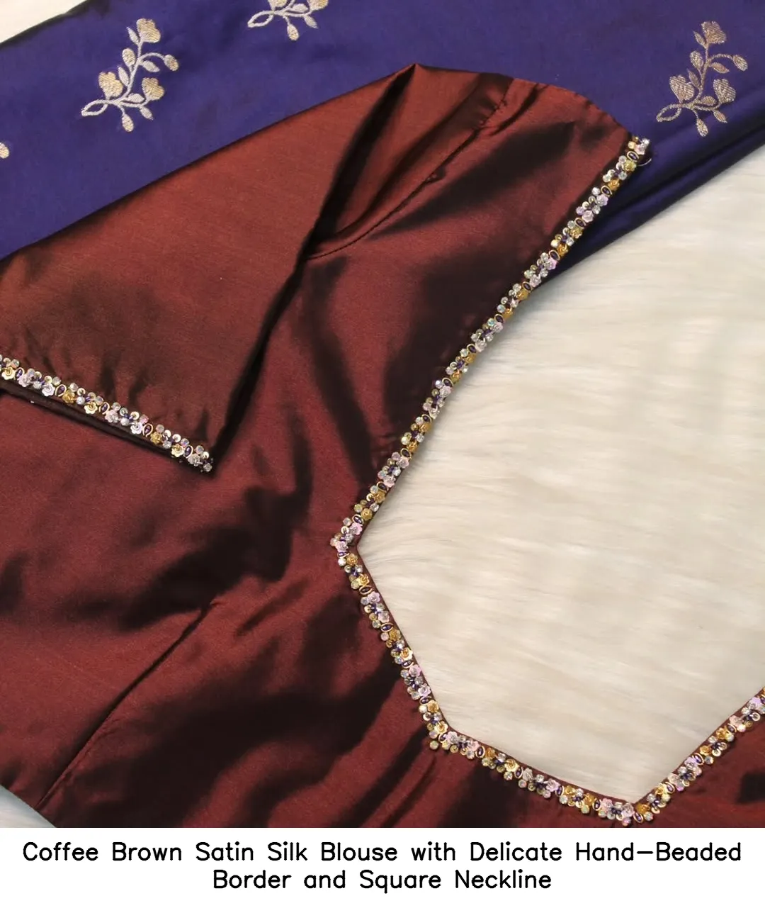 Coffee Brown Satin Silk Blouse with Delicate Hand-Beaded Border and Square Neckline