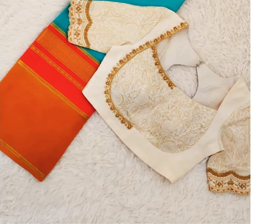 The Cream Colour Wedding Maggam Aari Work Blouse Online Budget Bridal Exclusive features half pattu fabric that is both stylish and comfortable. Available in sizes XL, XXL, and 3XL, it accommodates different body shapes. You can also browse our collection for more options.