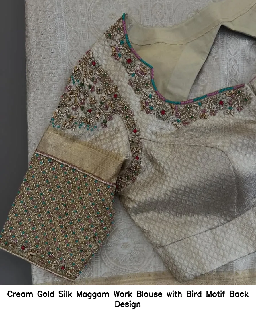 Cream Gold Silk Maggam Work Blouse with Bird Motif Back Design