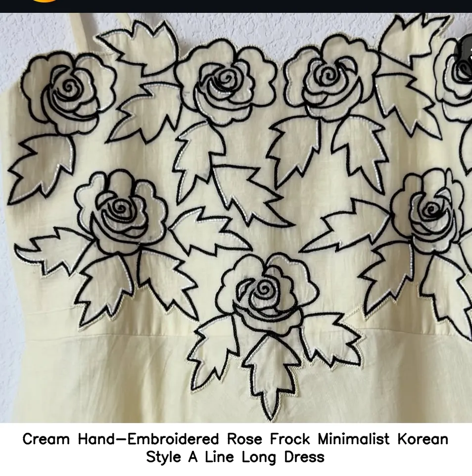 Cream Hand-Embroidered Rose Frock Minimalist Korean Style A Line Long Dress
