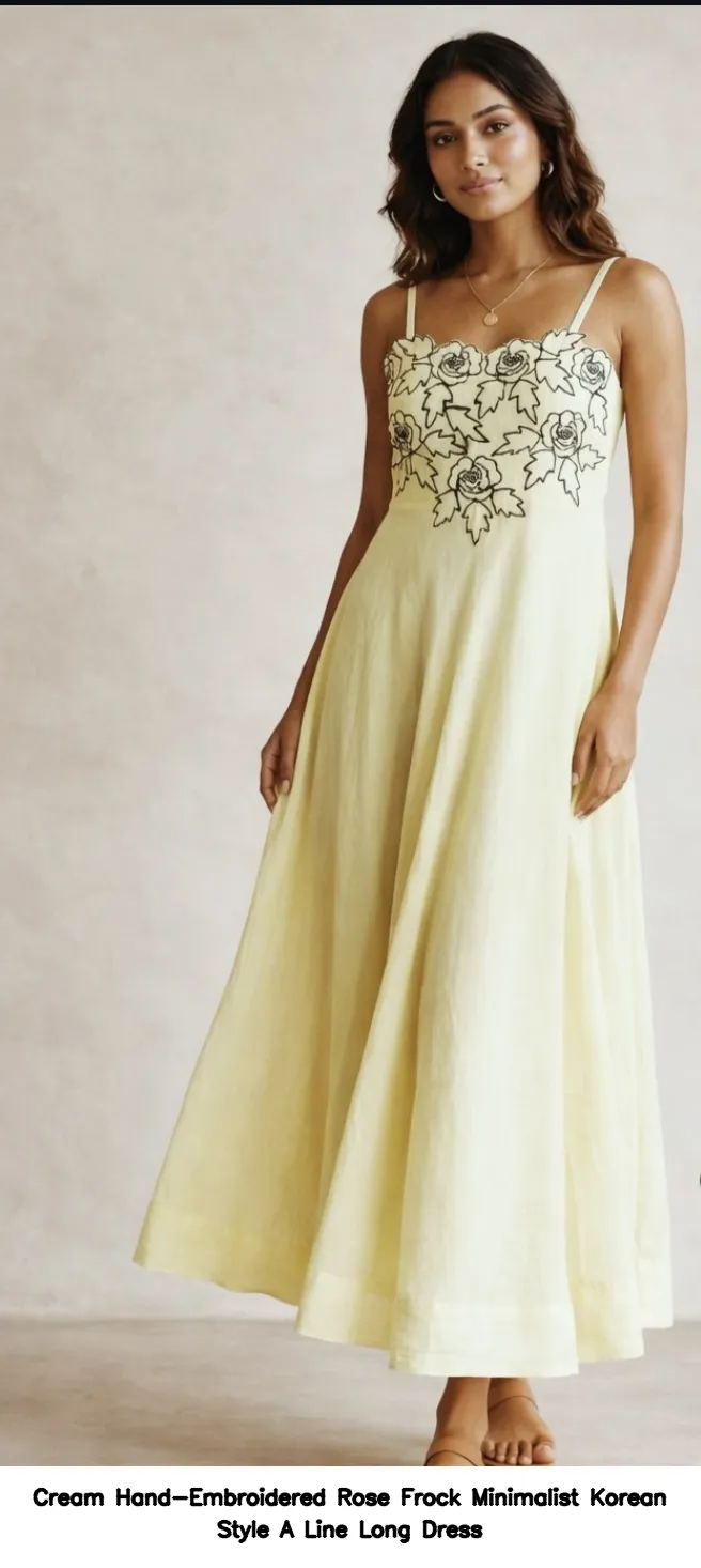 This Cream Hand-Embroidered Rose Frock Minimalist Korean Style A Line Long Dress is priced at 4000 INR. It is crafted from high-quality kota cotton, ensuring durability and comfort. Ideal for casual outings or special occasions.