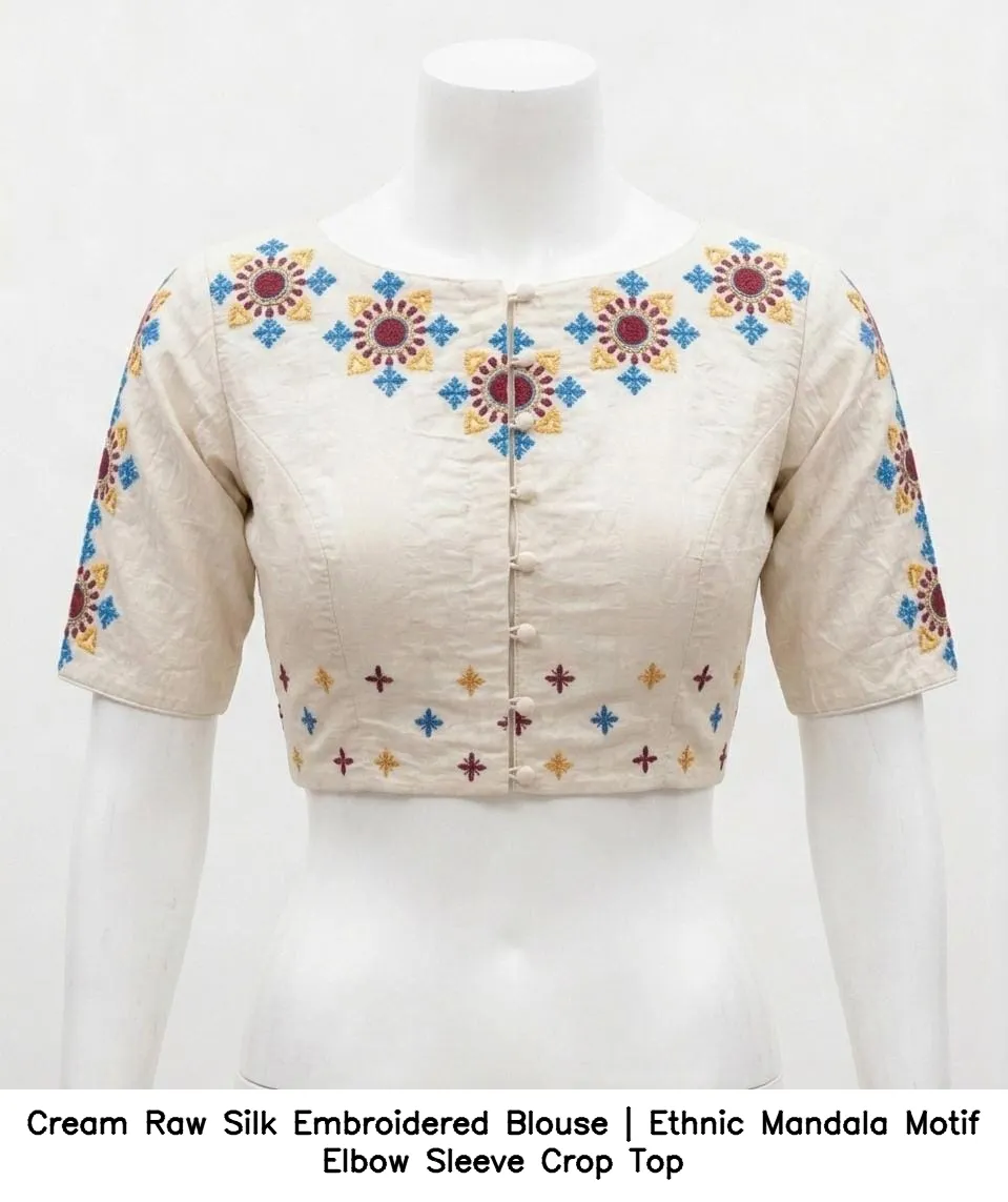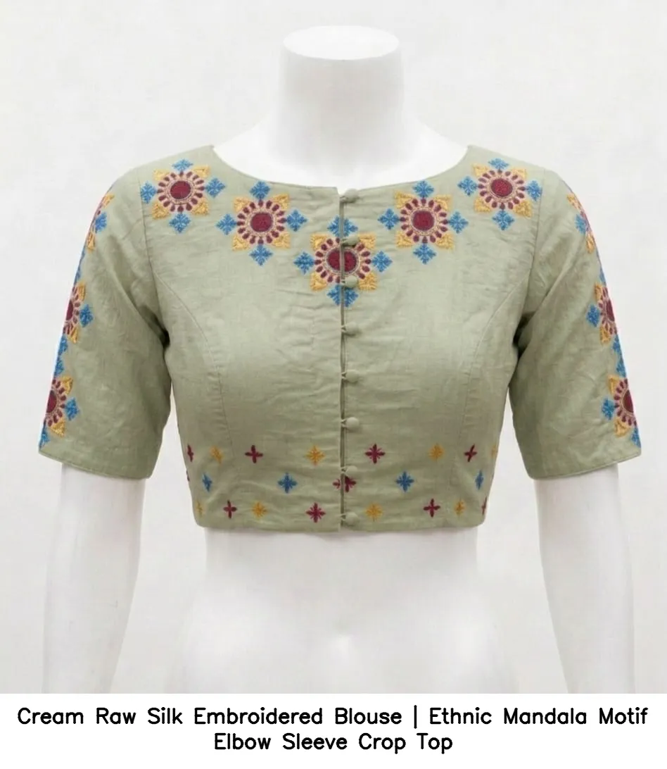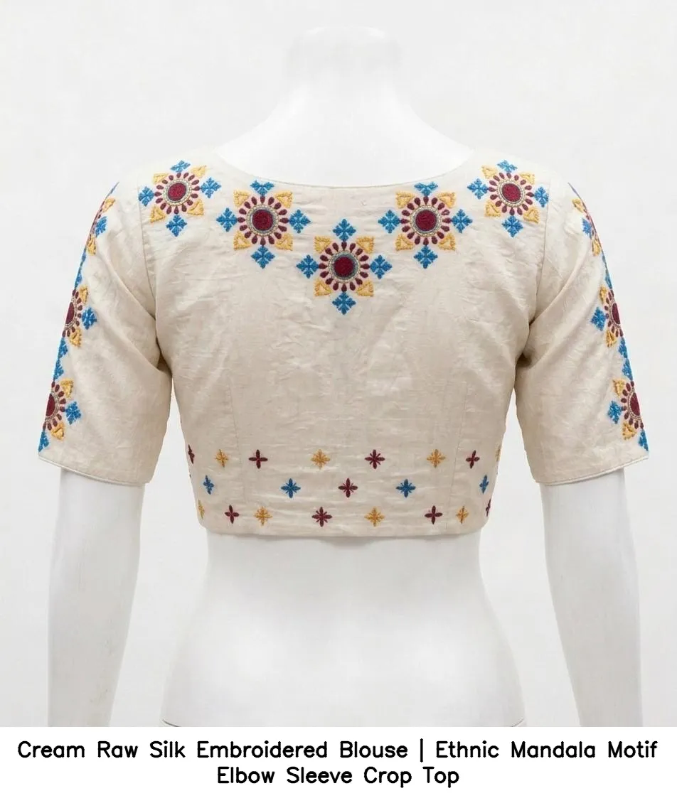 Cream Raw Silk Embroidered Blouse | Ethnic Mandala Motif Elbow Sleeve Crop Top