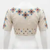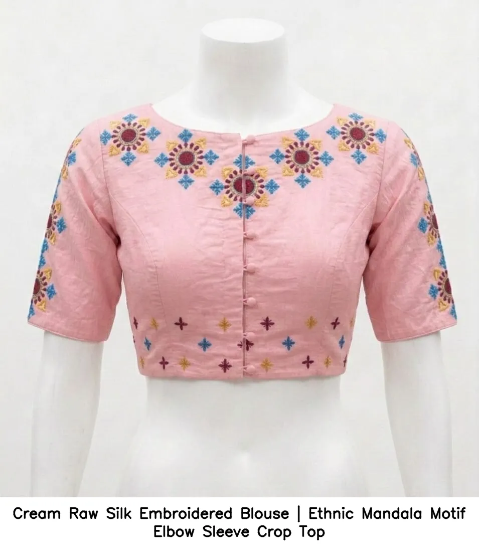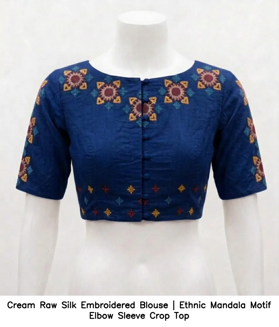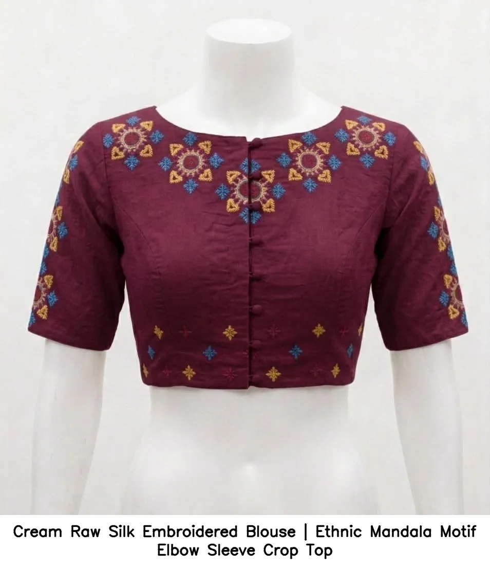Cream Raw Silk Embroidered Blouse | Ethnic Mandala Motif Elbow Sleeve Crop Top