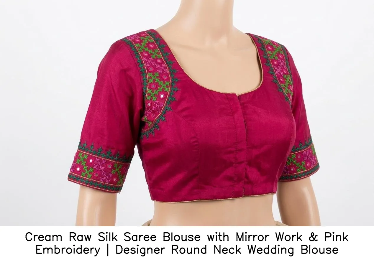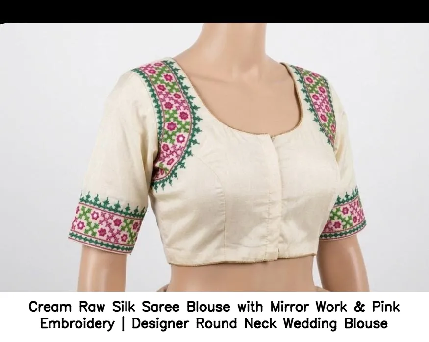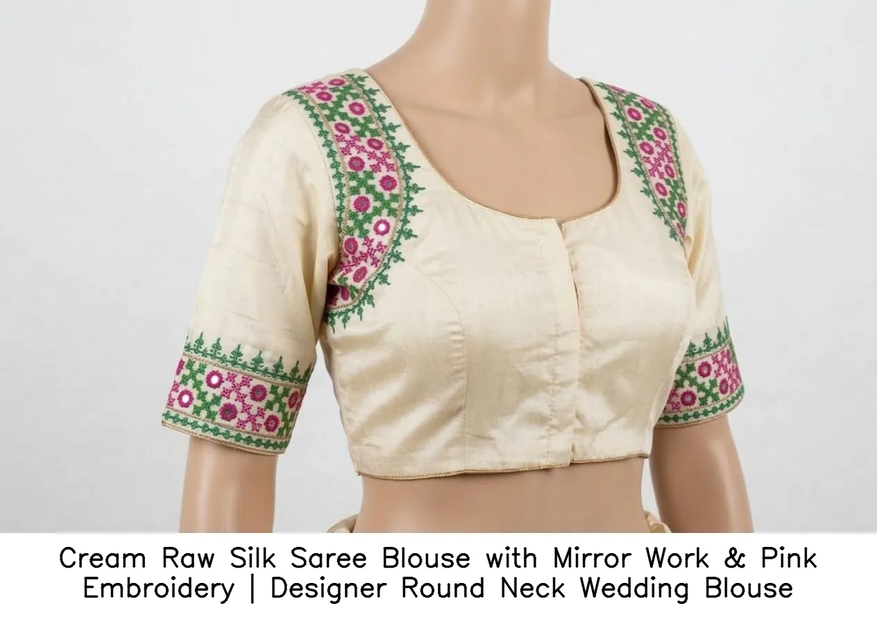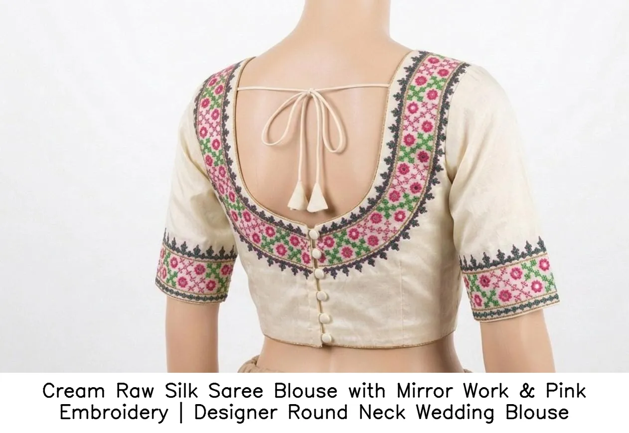 Cream Raw Silk Saree Blouse with Mirror Work & Pink Embroidery | Designer Round Neck Wedding Blouse