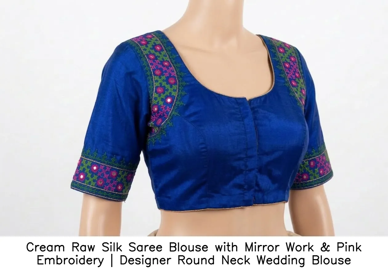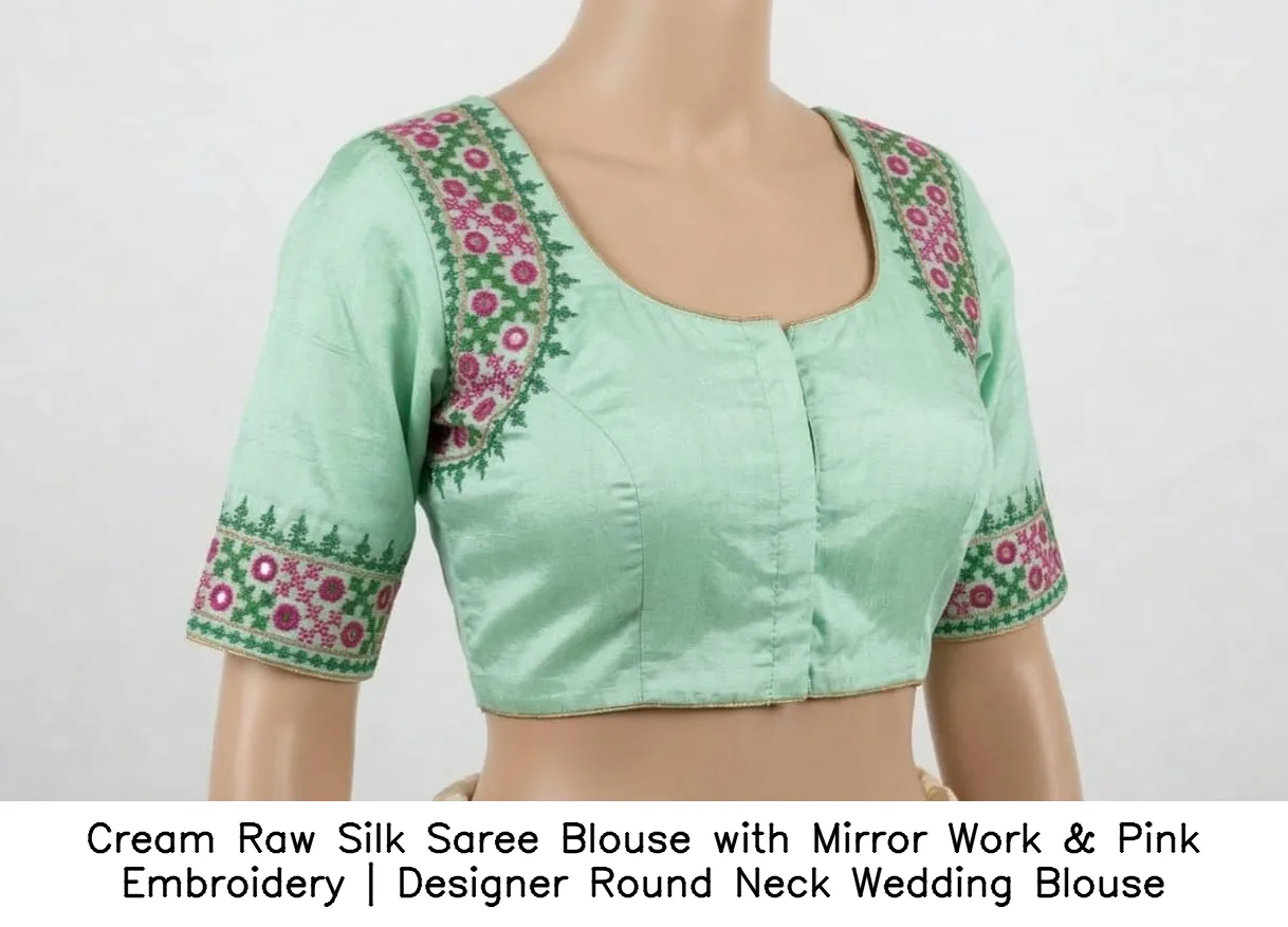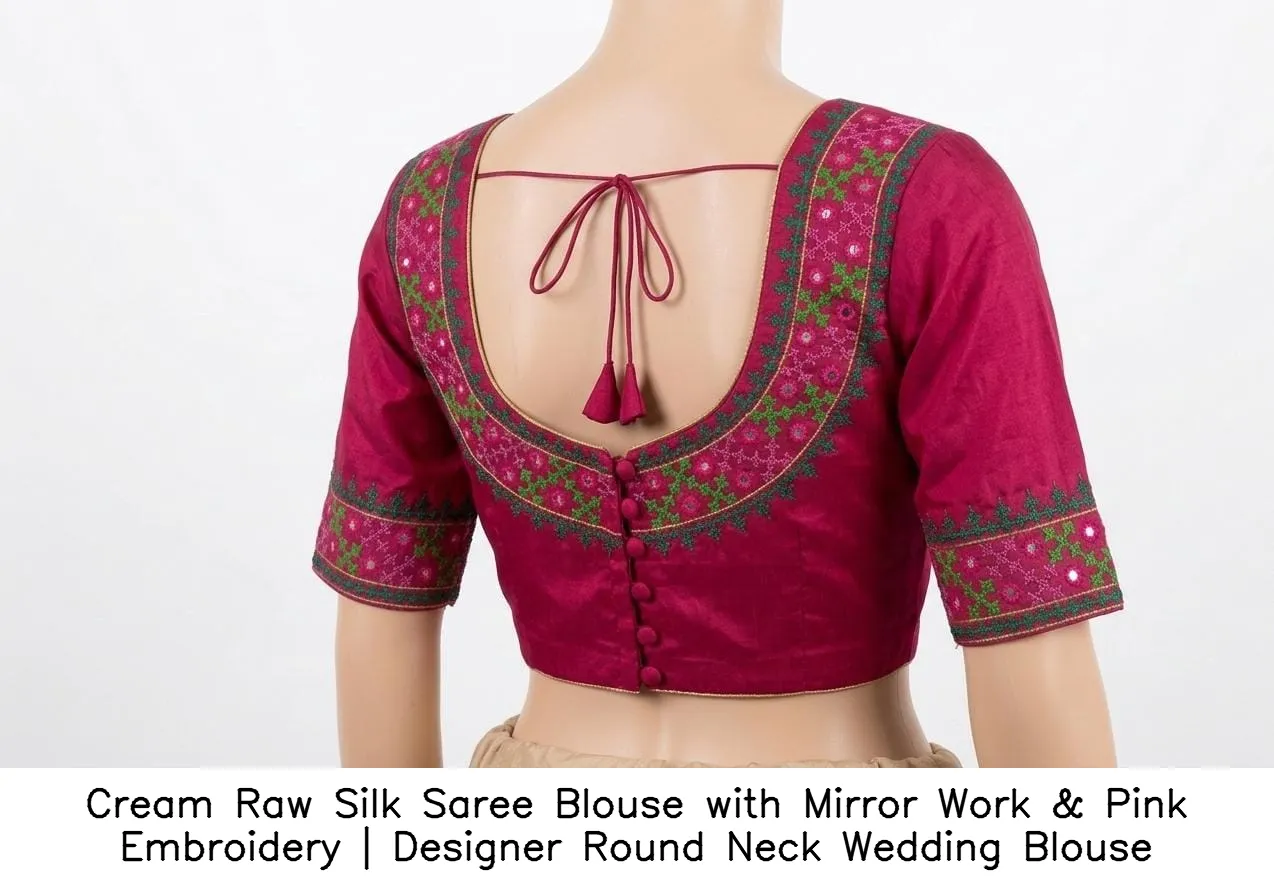 Cream Raw Silk Saree Blouse with Mirror Work & Pink Embroidery | Designer Round Neck Wedding Blouse