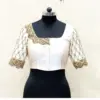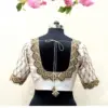 The Cream Silk Bridal Blouse with Heavy Gold Maggam Work – Diamond Scallop Border and Pearl Hanging Aari Embroidery is priced at just 4800 INR. It is made from half pattu silk, combining comfort with style.