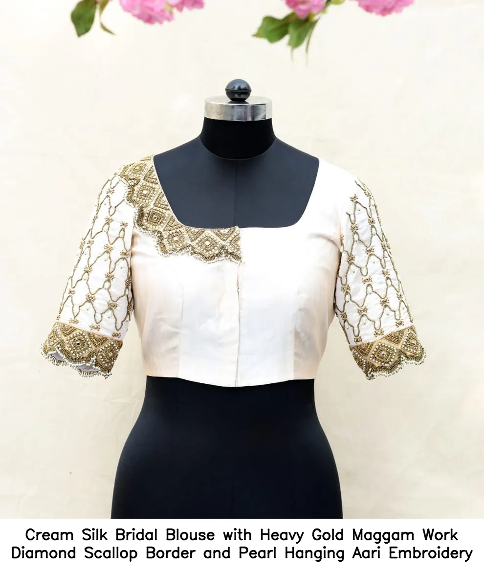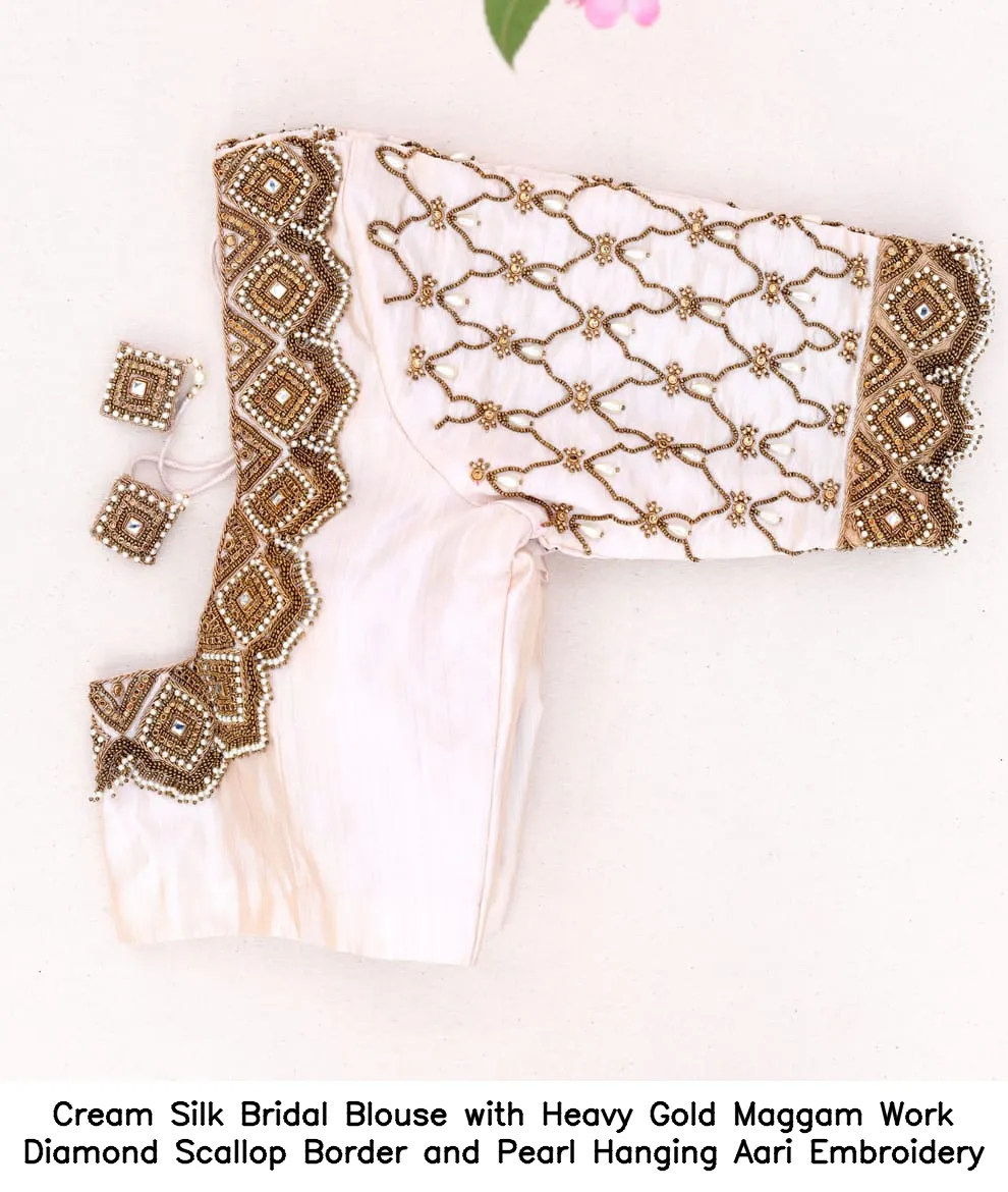 Cream Silk Bridal Blouse with Heavy Gold Maggam Work – Diamond Scallop Border and Pearl Hanging Aari Embroidery