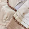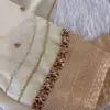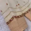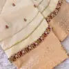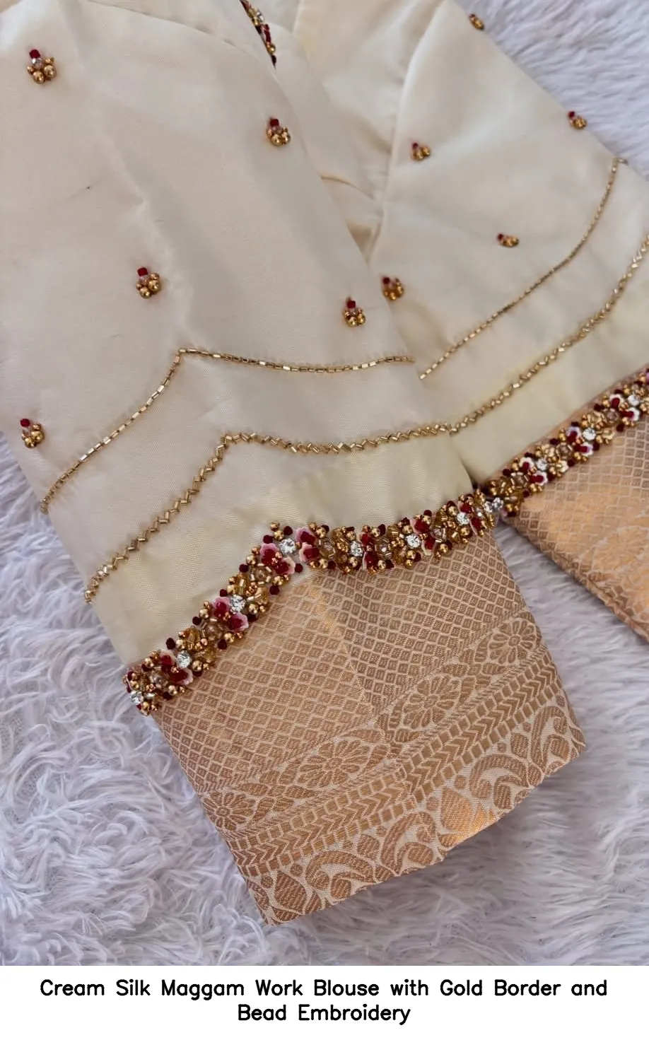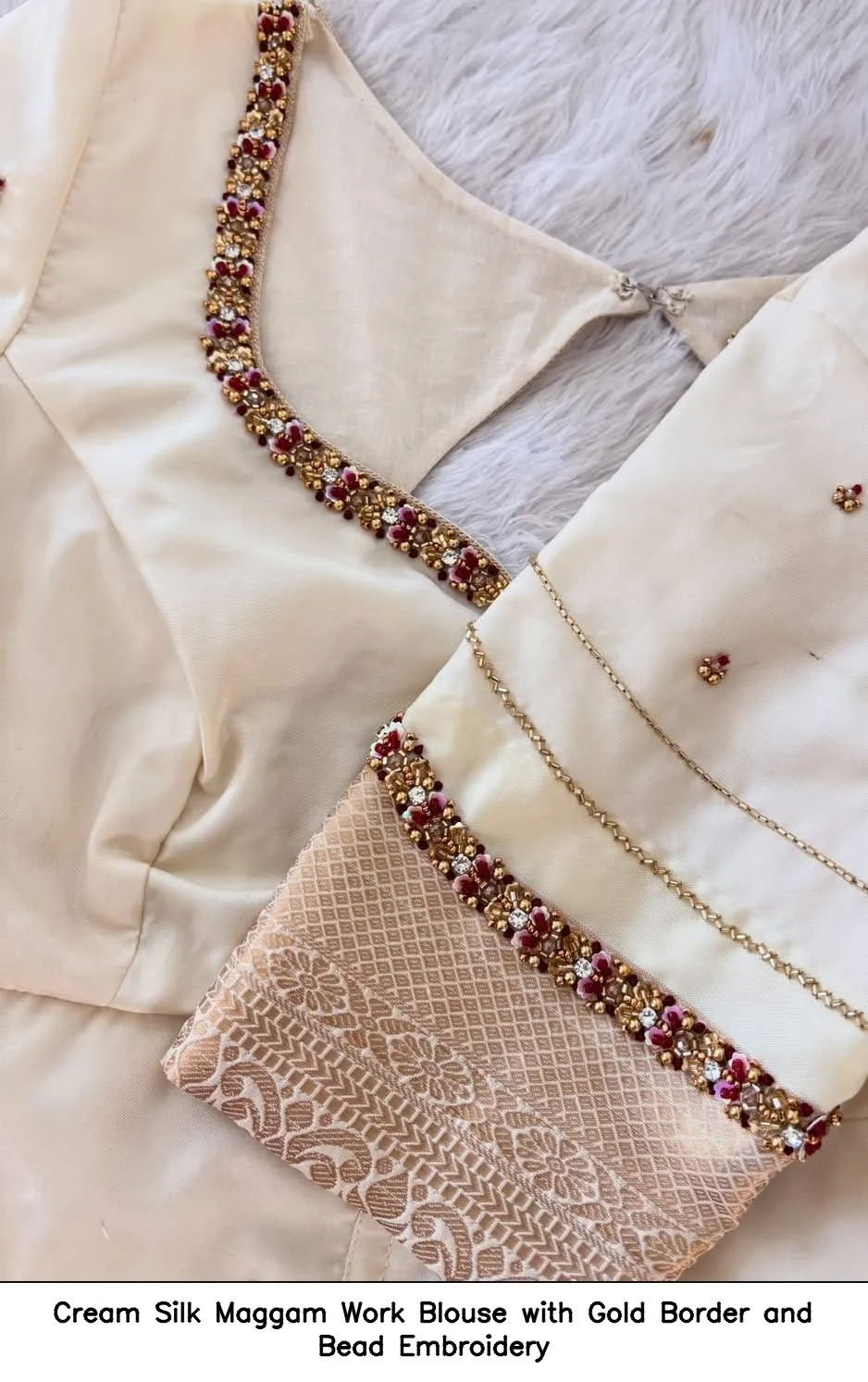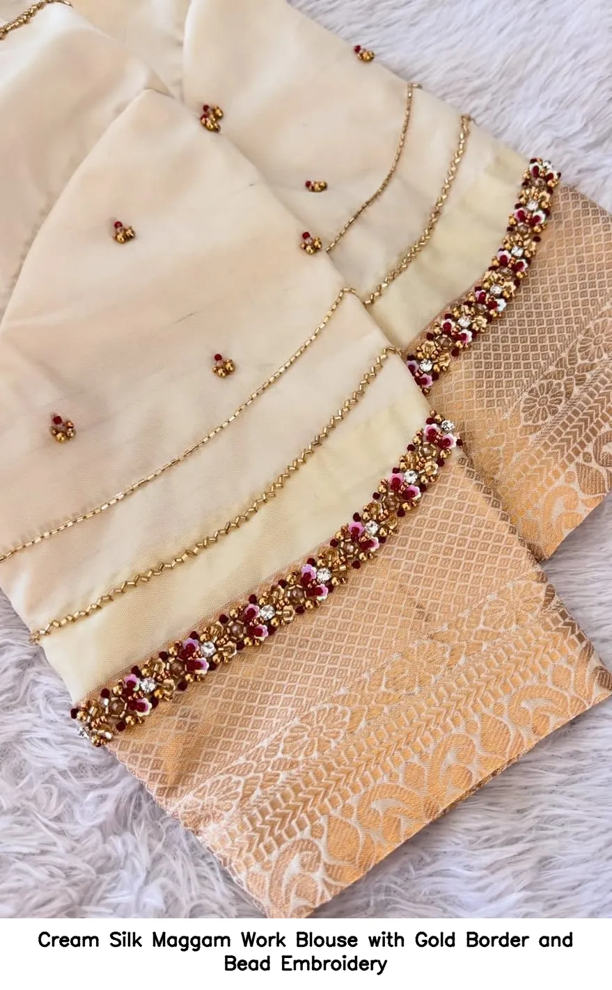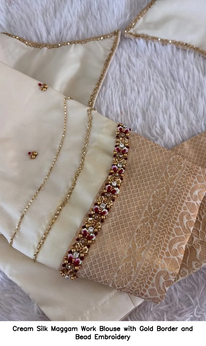 Product Name: Cream Silk Maggam Work Blouse with Gold Border and Bead Embroidery