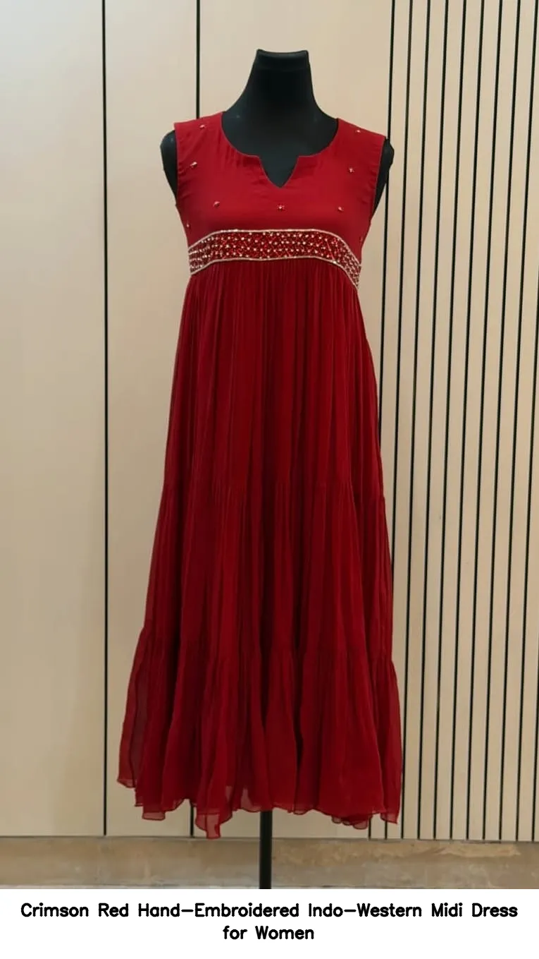 This beautiful Crimson Red Hand-Embroidered Indo-Western Midi Dress for Women is priced at 4500 INR. The premium georgette fabric ensures a luxurious feel while maintaining breathability. Itβs ideal for both casual and festive occasions.