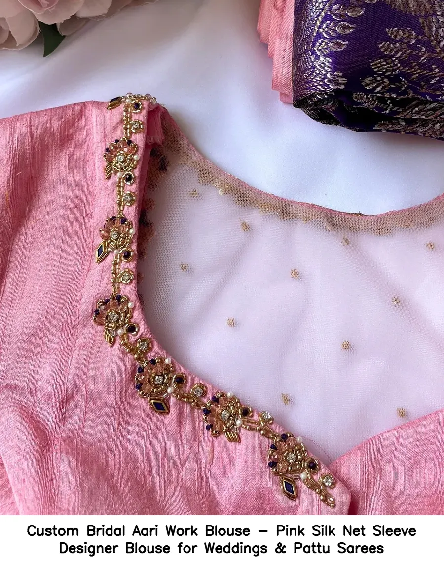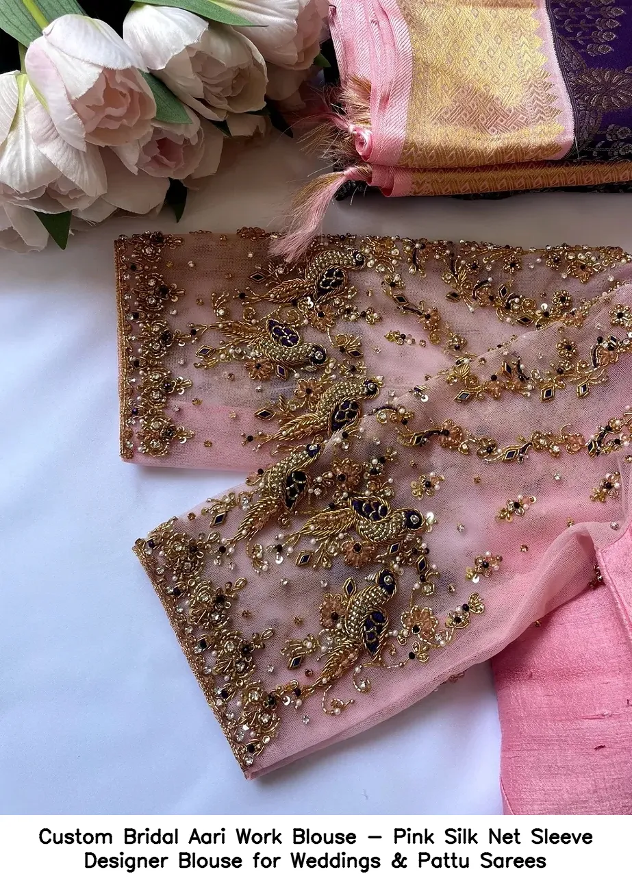 Custom Bridal Aari Work Blouse – Pink Silk Net Sleeve Designer Blouse for Weddings & Pattu Sarees